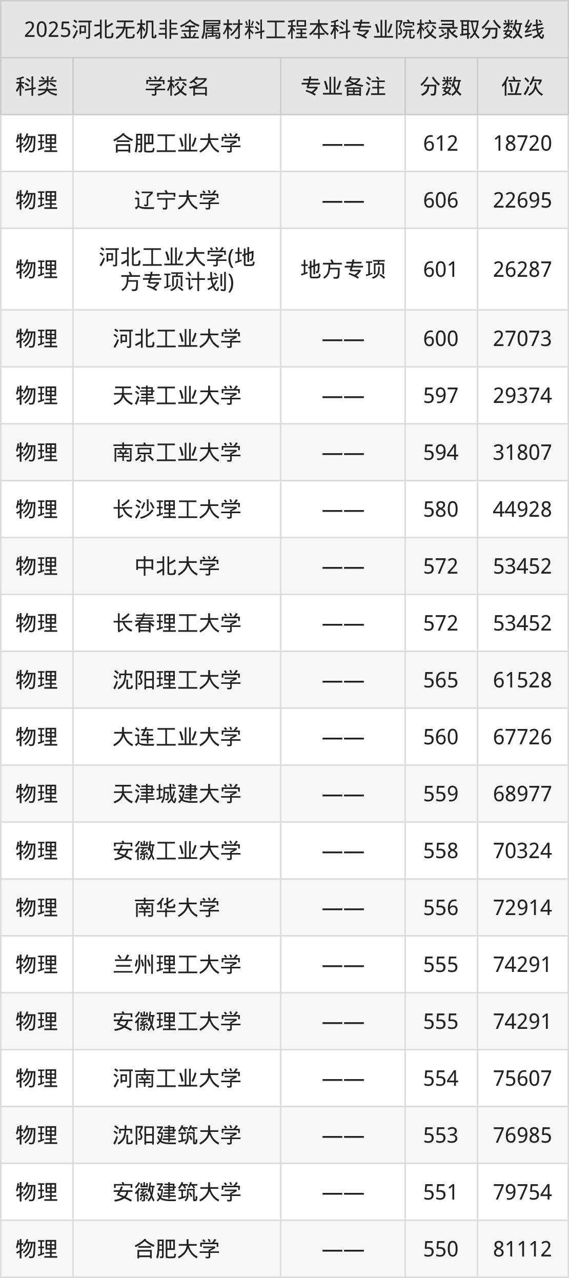 1、合肥工业大学:无机非金属材料工程612分、物理类位次18720名;