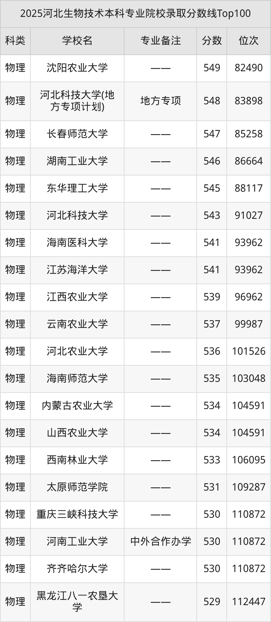 最新一年河北省生物技术专业大学综合实力排名表(软科本科排名):