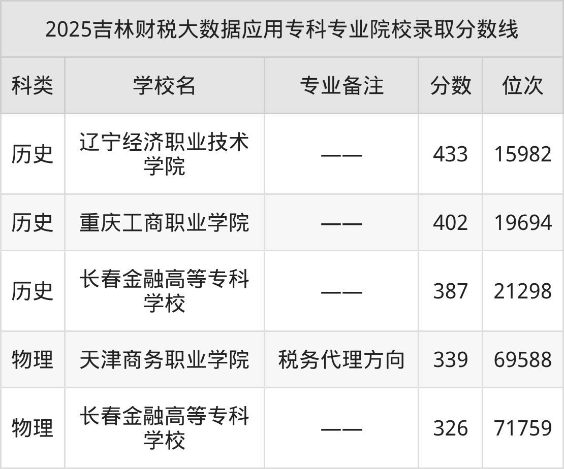 从院校办学性质来看,专科财税大数据应用公办院校最低分在326分及以上,低分对应院校为长春金融高等专科学校,2025年超专科线166分录取。