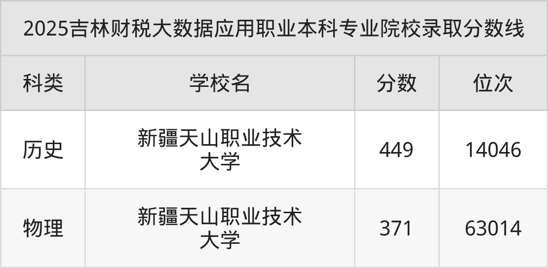 2025年吉林财税大数据应用职业本科专业招生院校只有1所,即新疆天山职业技术大学,2025年该校财税大数据应用专业在吉林省的最低录取分数线为371分,最低录取位次在63014名及以内(物理类)。