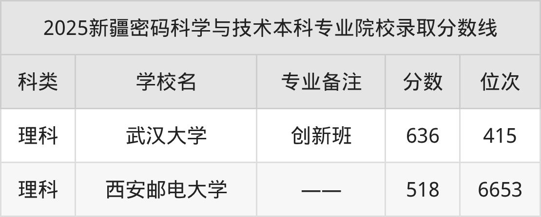 2025年新疆密码科学与技术分数线排名前2的大学名单(本科最难报考):