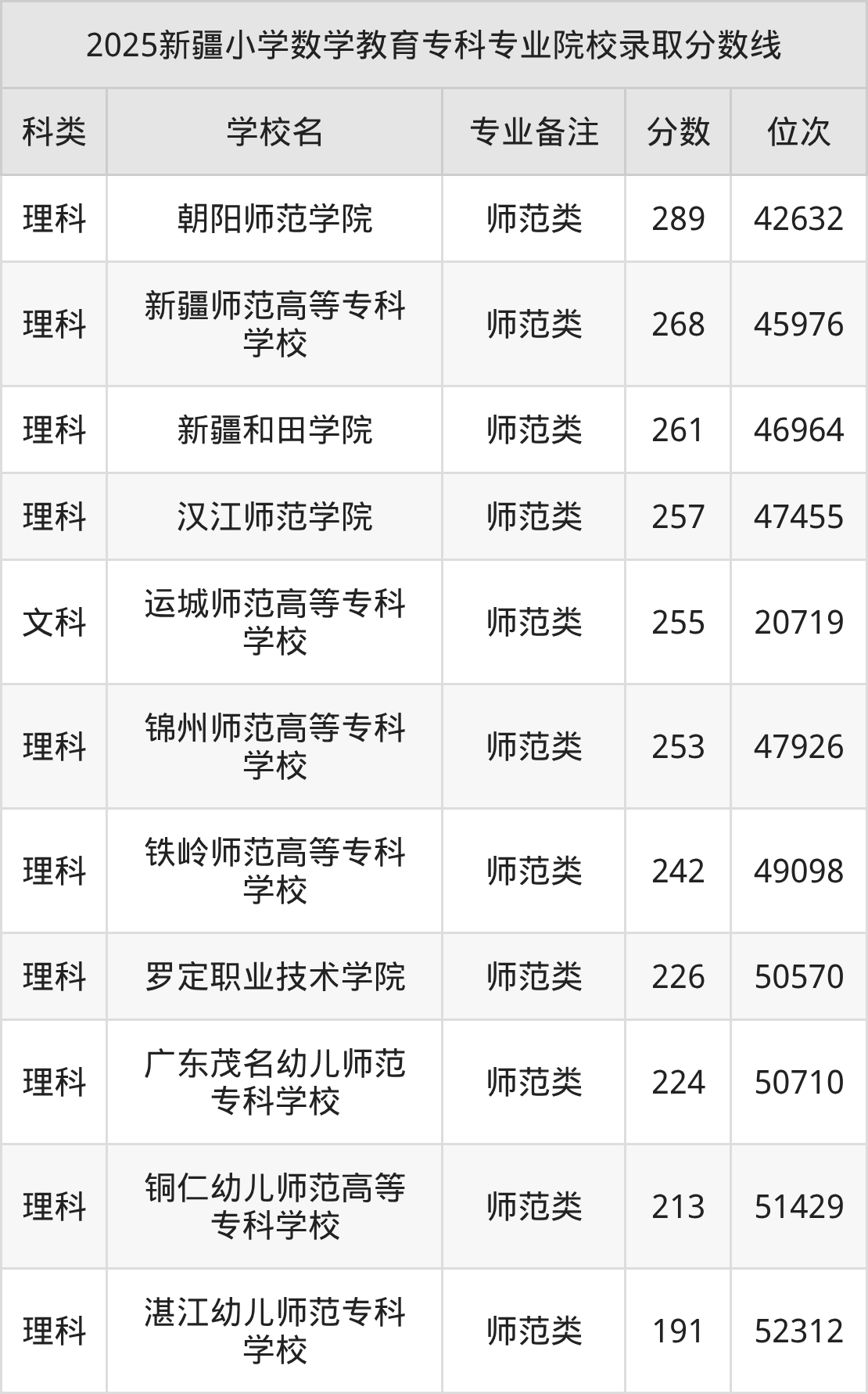 2025小学数学教育专业在新疆录取分数线为:专科191分-289分。结合批次线来看,考生成绩超专科线51分及以上即有机会就读小学数学教育专科专业,低分录取的专科院校有湛江幼儿师范专科学校。2026届考生可在下文查阅更多院校名单、分数及排名信息。