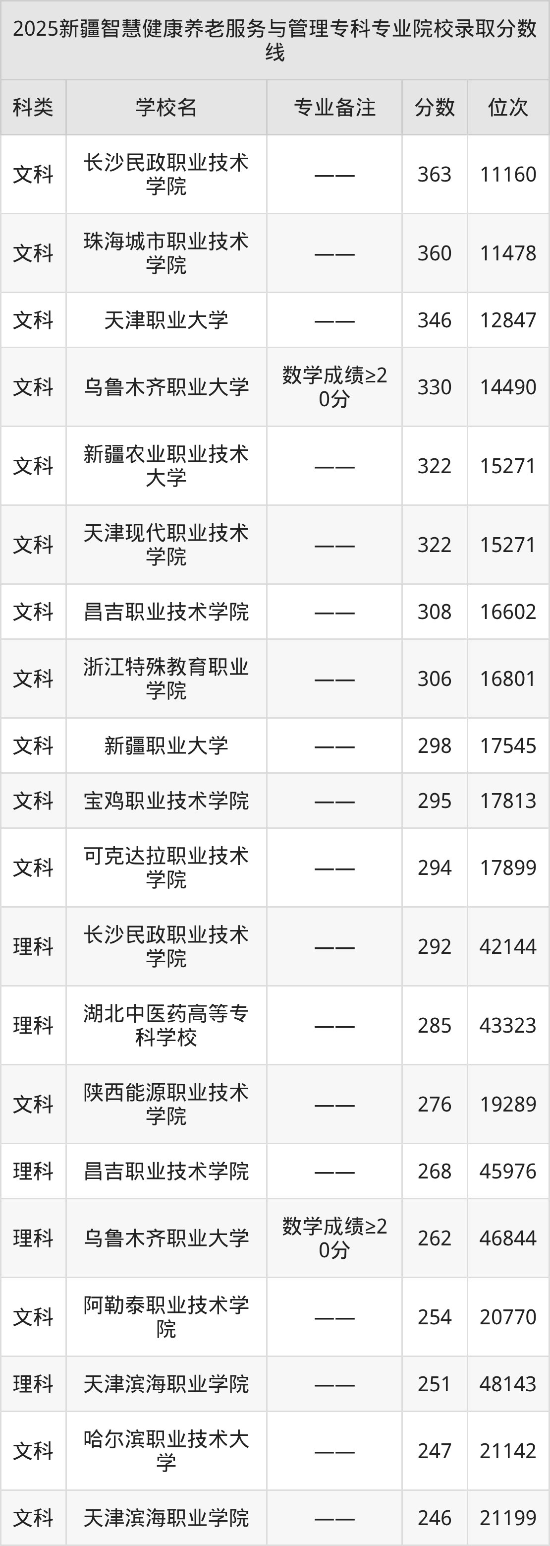 4、乌鲁木齐职业大学:智慧健康养老服务与管理(数学成绩≥20分)330分、文科位次14490名;
