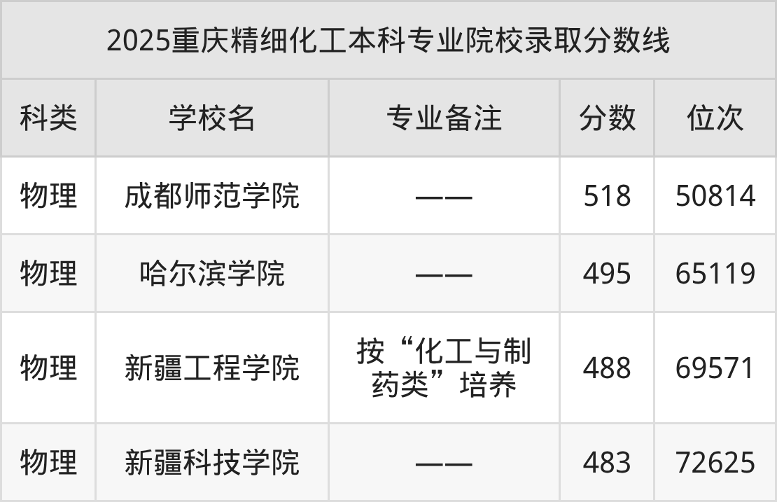 2025精细化工专业在重庆市录取分数线为:本科483分-518分。结合批次线来看,考生成绩超本科线58分及以上即有机会就读精细化工本科专业,低分录取的本科院校有新疆科技学院。2026届考生可在下文查阅更多院校名单、分数及排名信息。