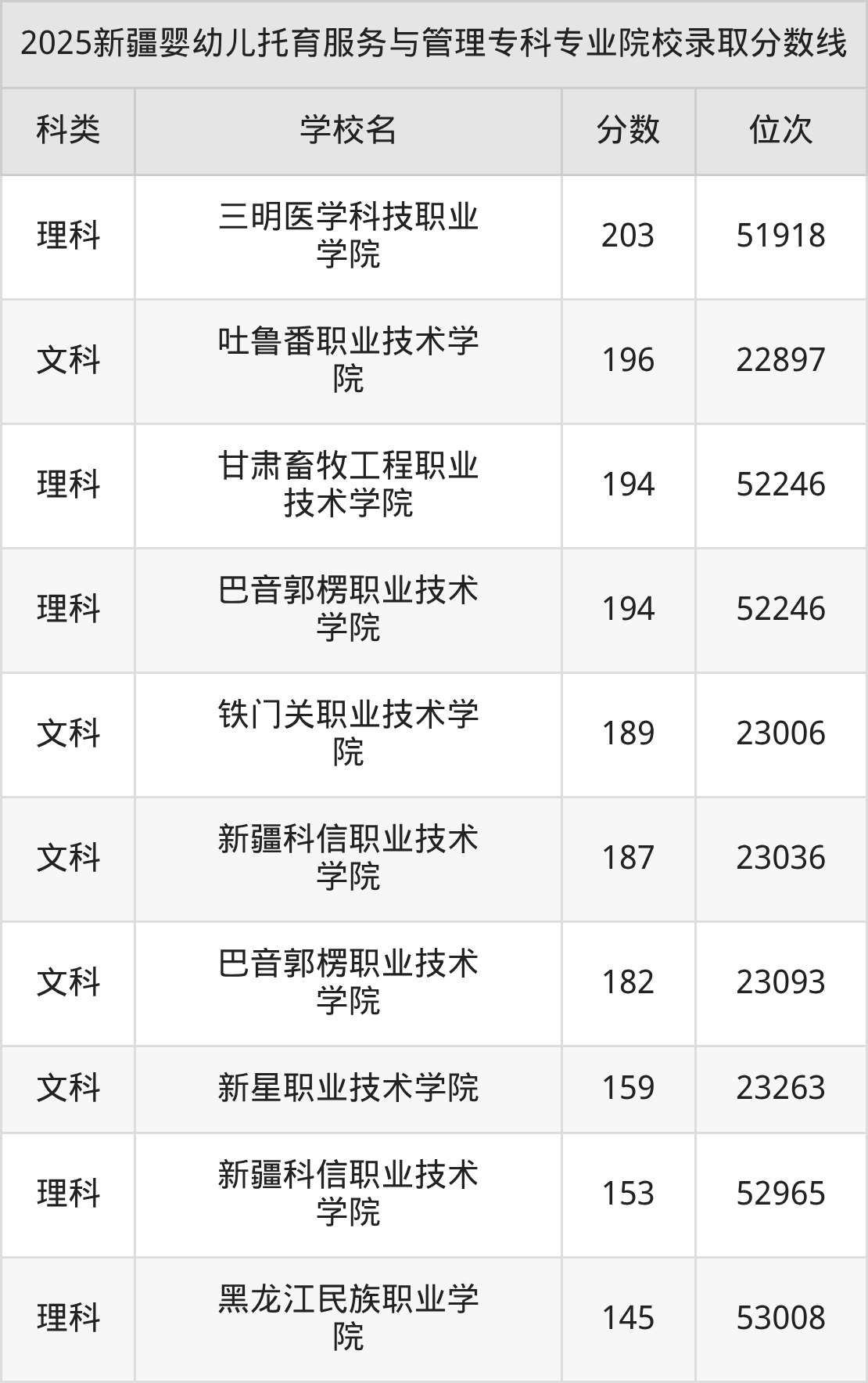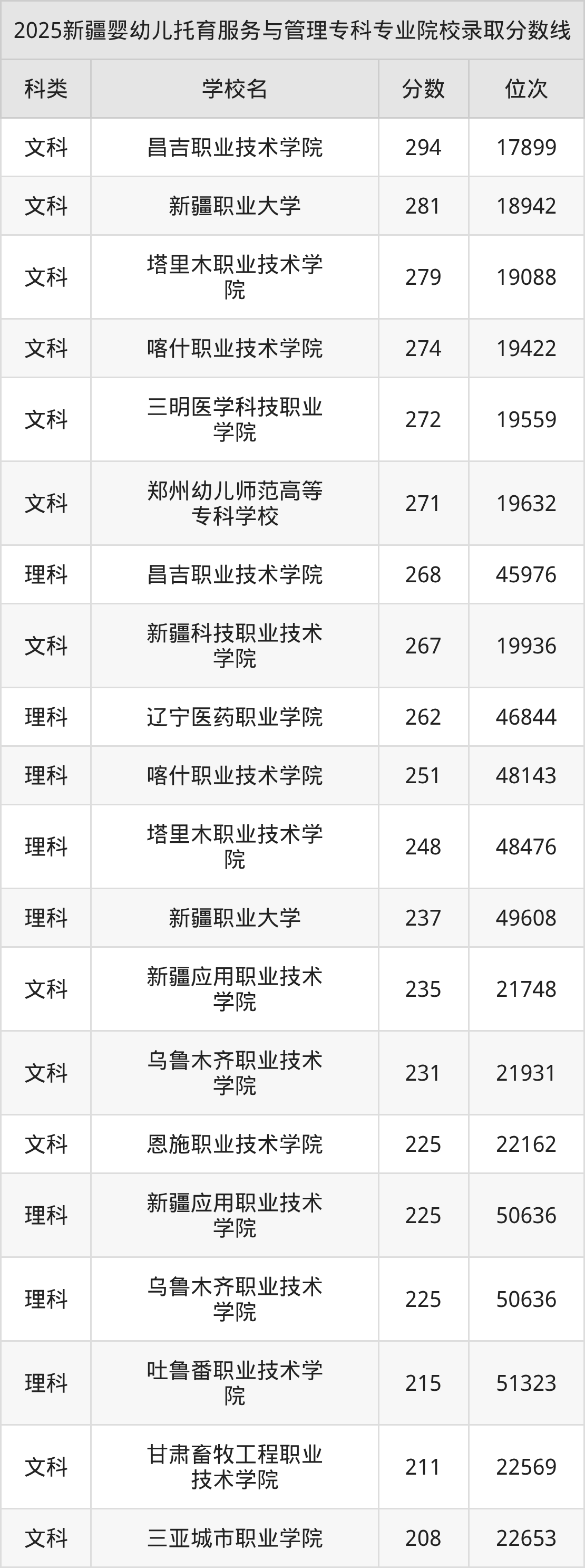 2025年新疆婴幼儿托育服务与管理分数线排名前5的大学名单(专科最难报考):