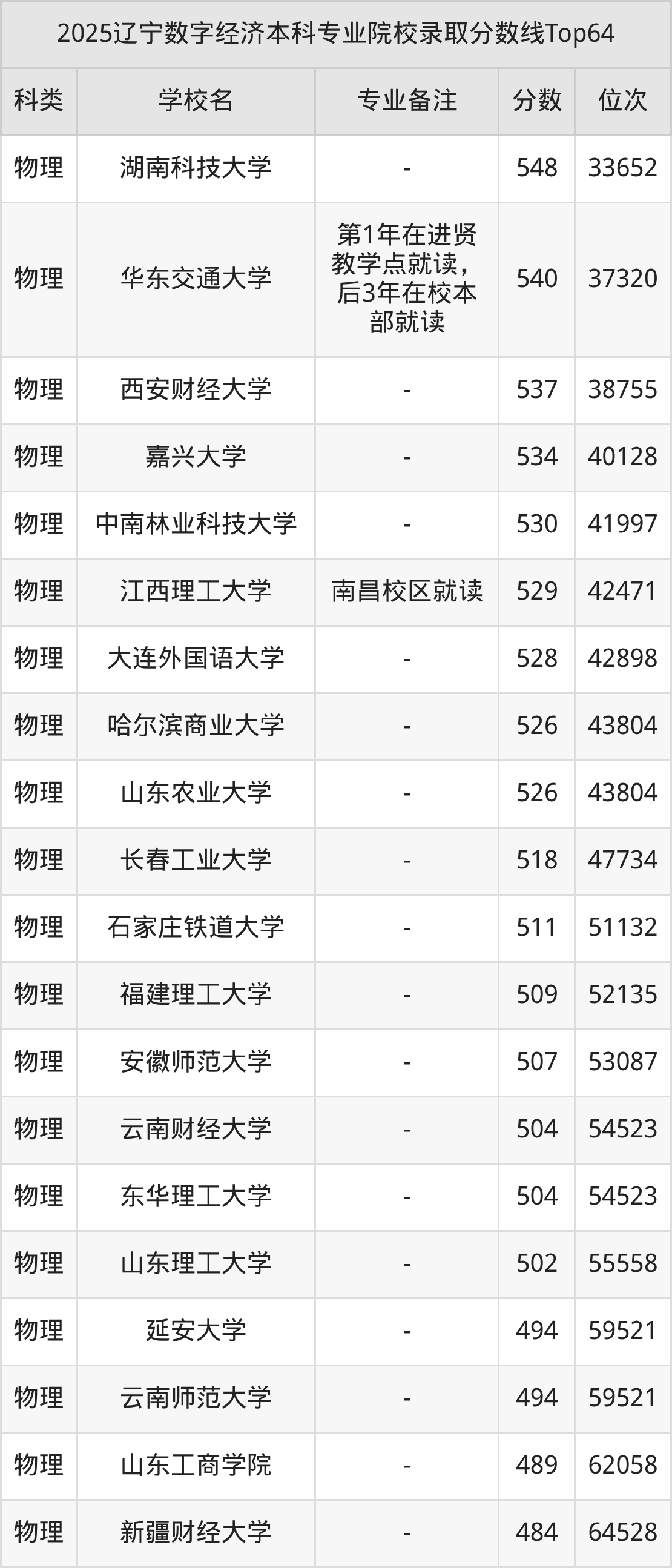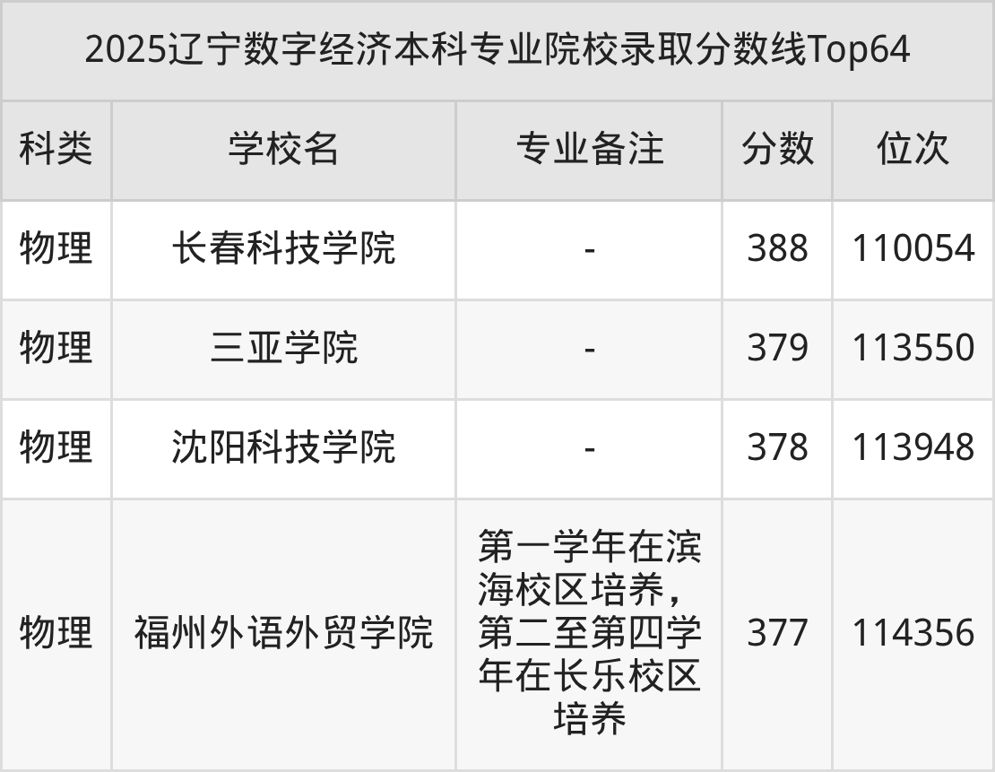 2025年辽宁数字经济本科专业招生院校有64所,分数最低的是福州外语外贸学院(377分、物理类位次114356名),分数最高的是华中科技大学(664分、物理类位次1110名)。