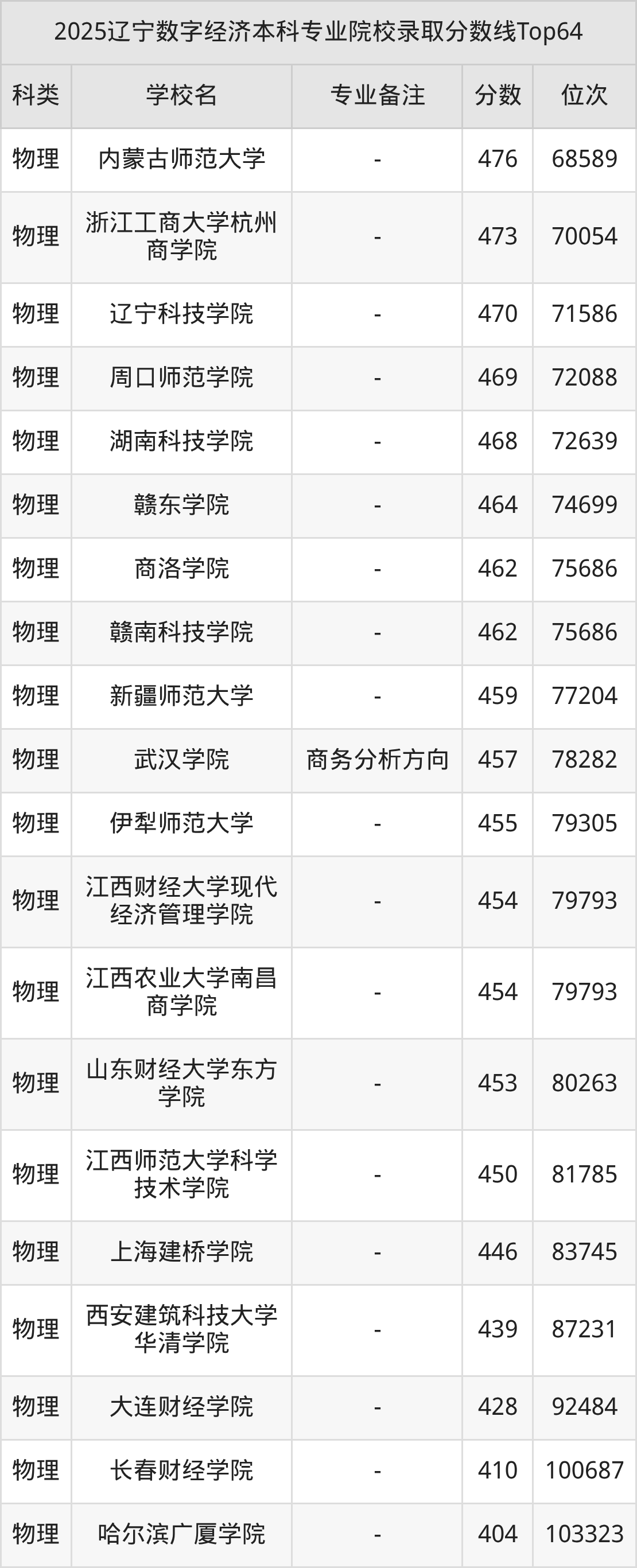 2025数字经济专业在辽宁省录取分数线为:本科377分-664分。结合批次线来看,考生成绩超本科线10分及以上即有机会就读数字经济本科专业,低分录取的本科院校有福州外语外贸学院。2026届考生可在下文查阅更多院校名单、分数及排名信息。