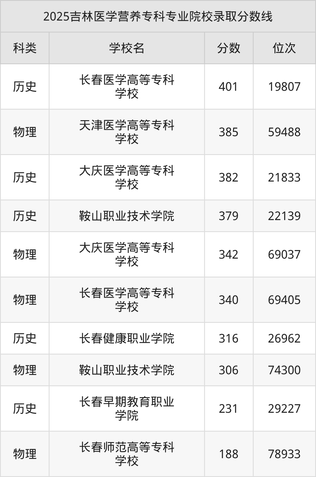 1、长春医学高等专科学校:医学营养401分、历史类位次19807名;