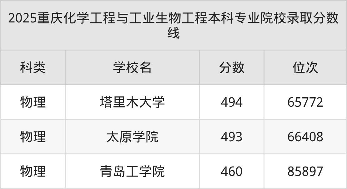 2025年重庆化学工程与工业生物工程本科专业招生院校有3所,分数最低的是青岛工学院(460分、物理类位次85897名),分数最高的是塔里木大学(494分、物理类位次65772名)。