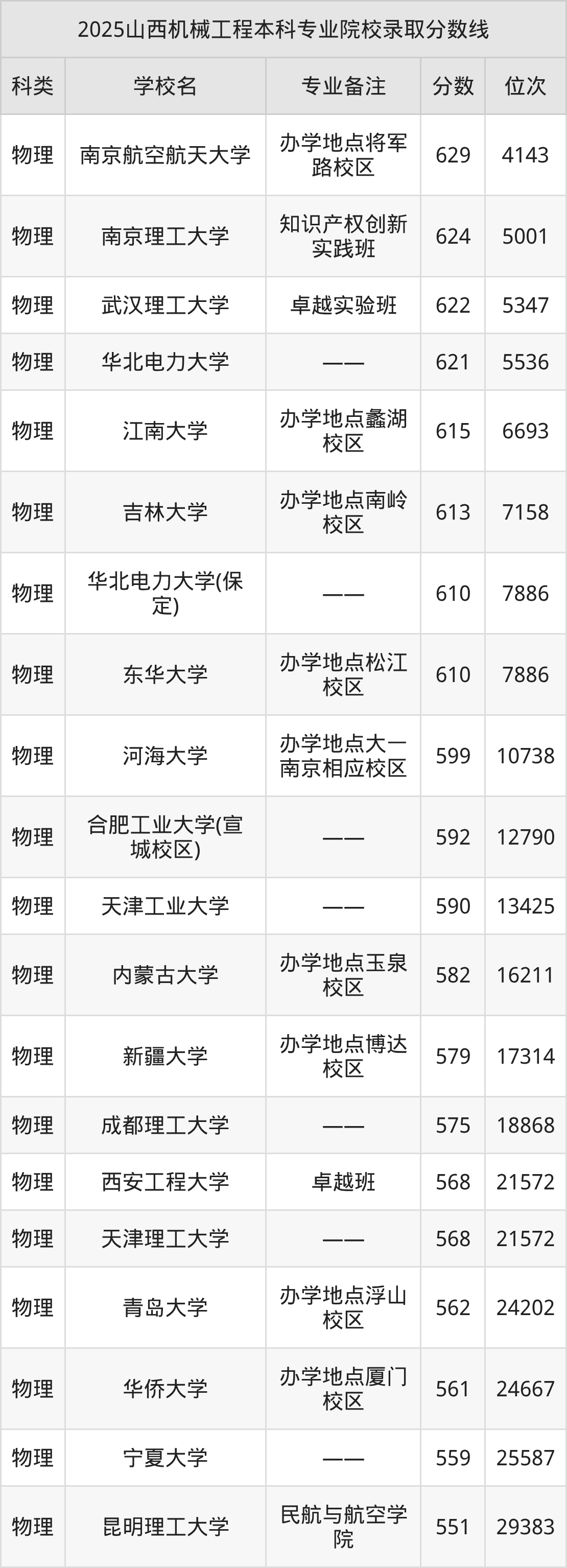 1、南京航空航天大学:机械工程(办学地点将军路校区)629分、物理类位次4143名;