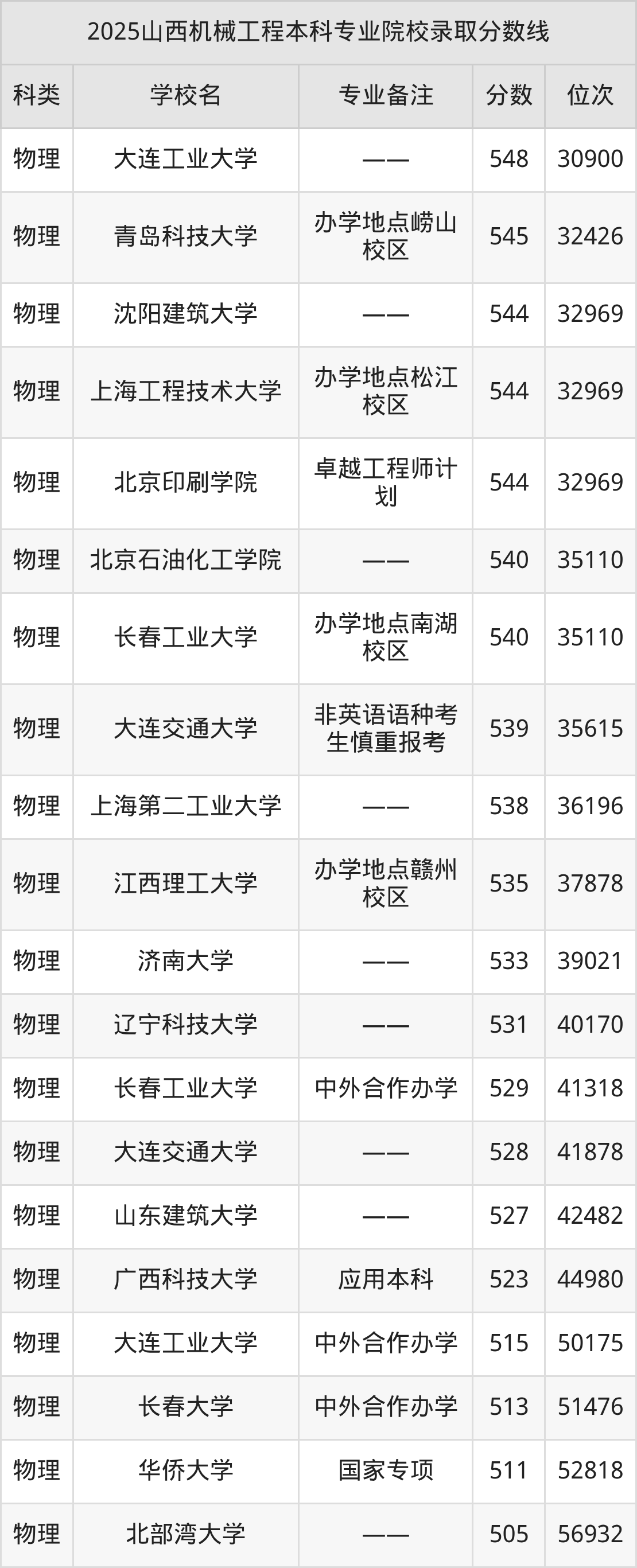 2025年山西机械工程分数线排名前5的大学名单(本科最难报考):