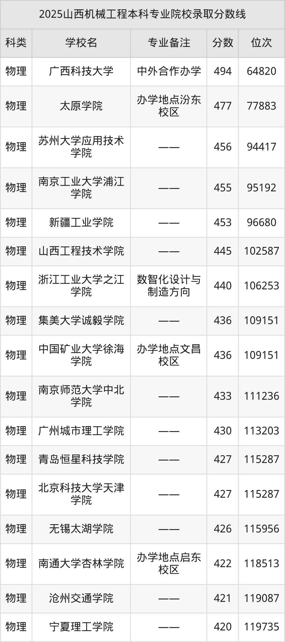 从院校办学性质来看,本科机械工程公办院校最低分在445分及以上,低分对应院校为山西工程技术学院,2025年超本科线26分录取。民办院校最低分在420分及以上,低分对应院校为宁夏理工学院,2025年超本科线1分录取。