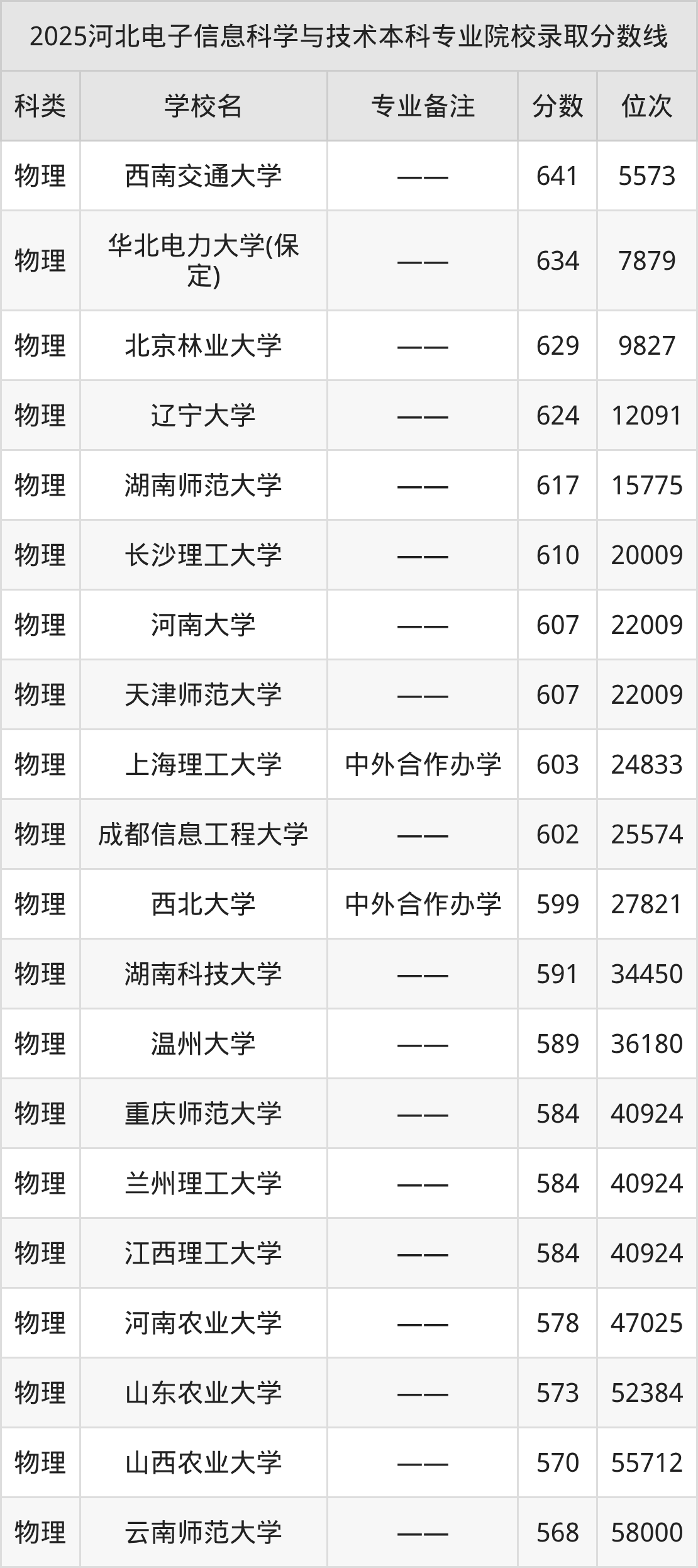 2025年河北电子信息科学与技术本科专业招生院校有61所,分数最低的是桂林信息科技学院(459分、物理类位次224230名),分数最高的是西南交通大学(641分、物理类位次5573名)。