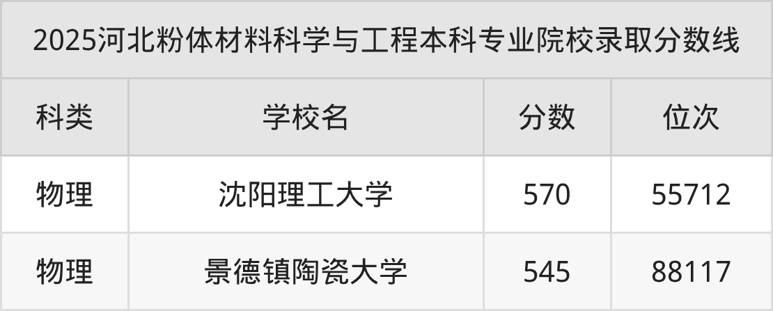 2025年河北粉体材料科学与工程分数线排名前2的大学名单(本科最难报考):