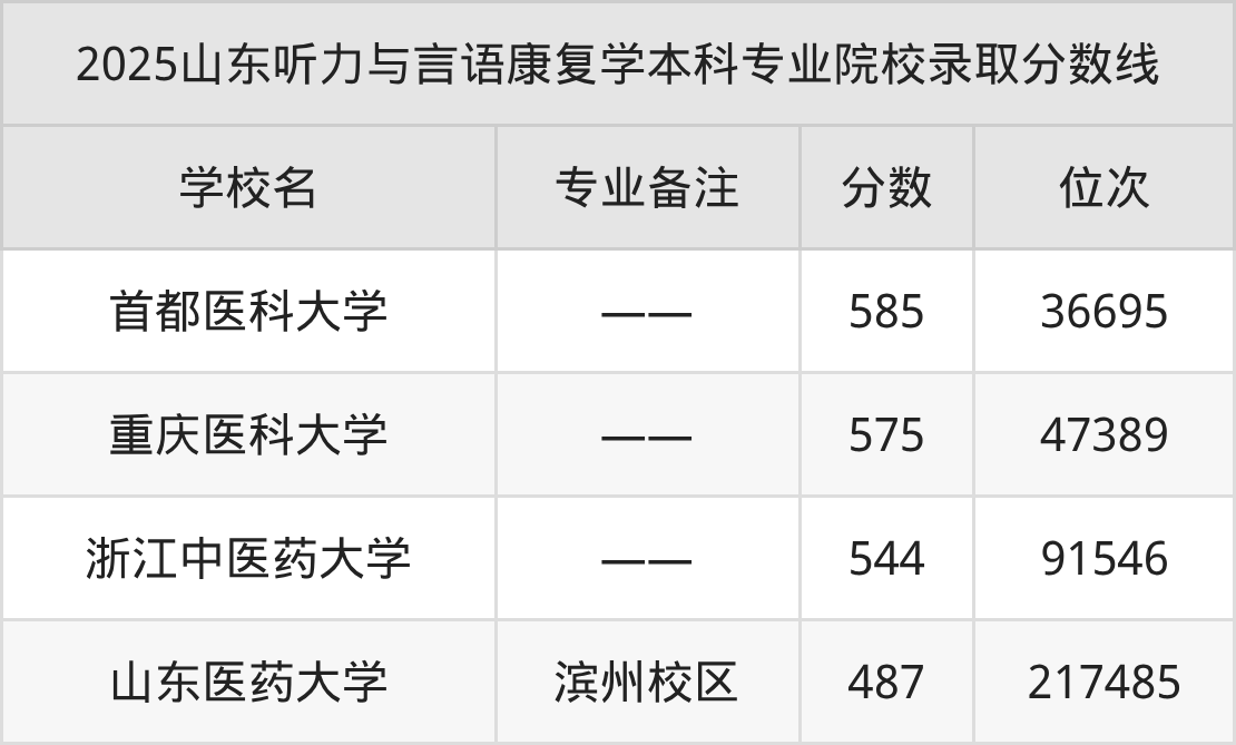 2025年山东听力与言语康复学本科专业招生院校有4所,分数最低的是山东医药大学(487分、位次217485名),分数最高的是首都医科大学(585分、位次36695名)。