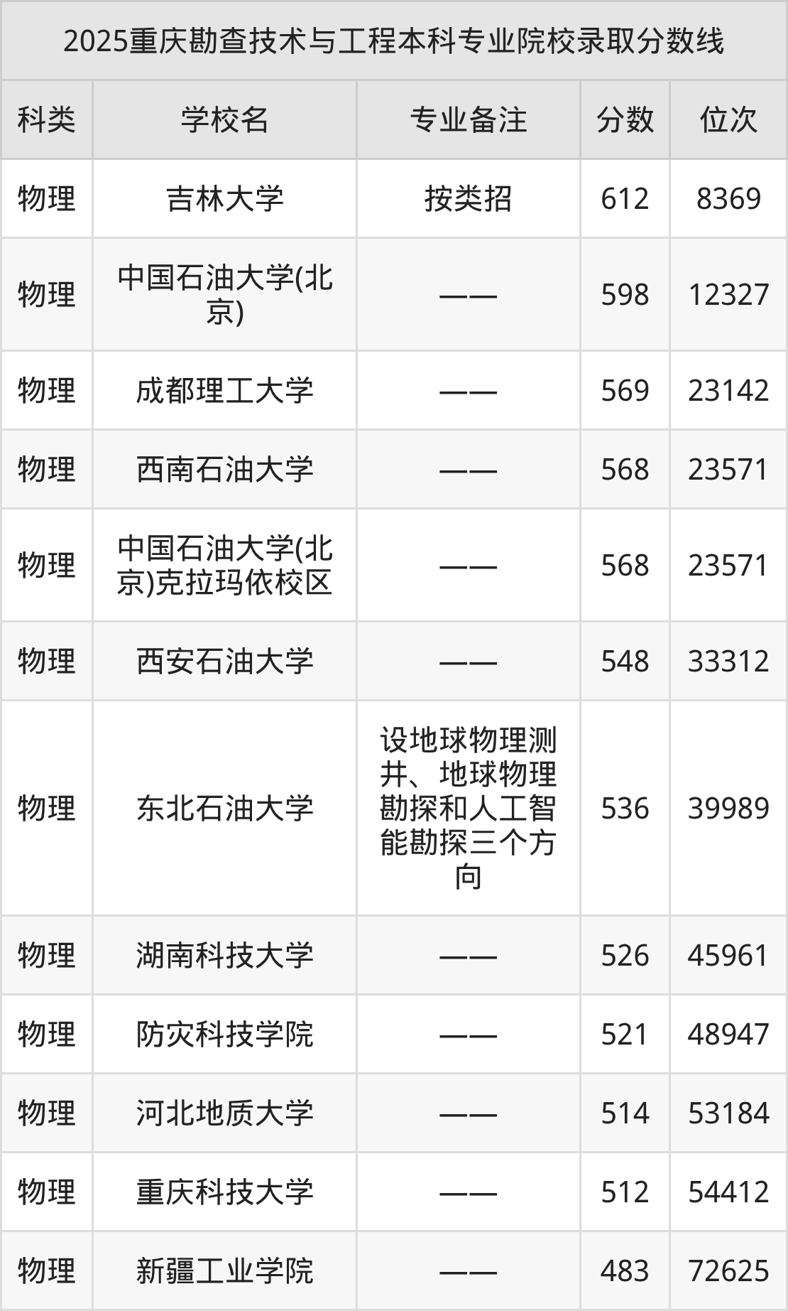 2025年重庆勘查技术与工程本科专业招生院校有11所,分数最低的是新疆工业学院(483分、物理类位次72625名),分数最高的是吉林大学(612分、物理类位次8369名)。