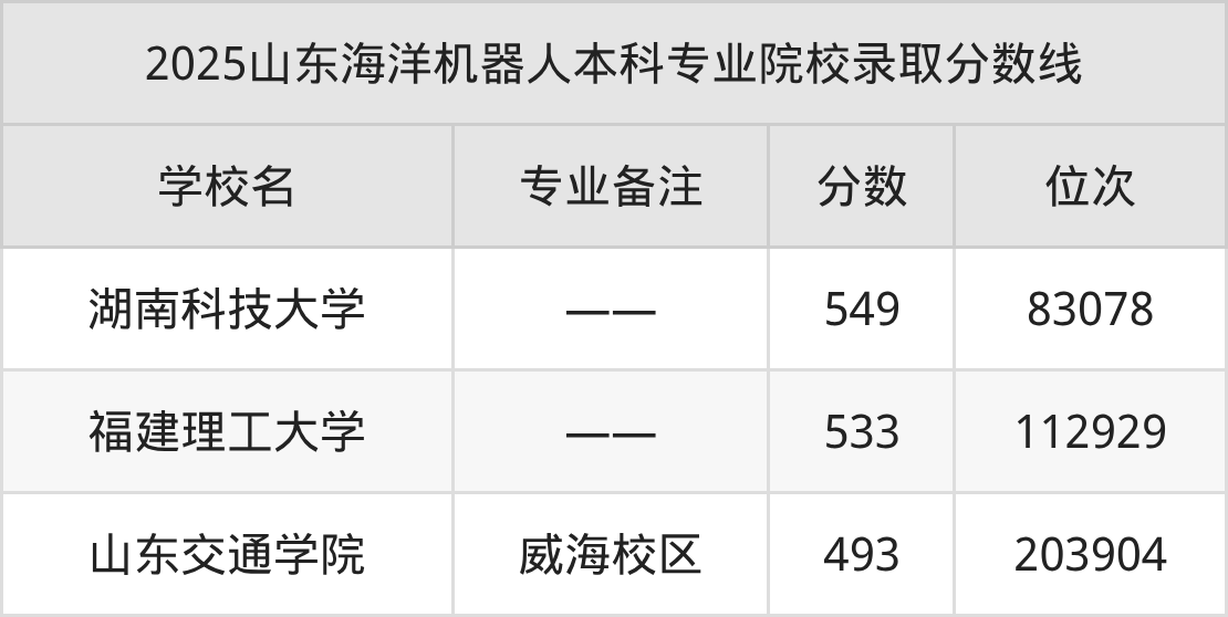 2025年山东海洋机器人本科专业招生院校有3所,分数最低的是山东交通学院(493分、位次203904名),分数最高的是湖南科技大学(549分、位次83078名)。