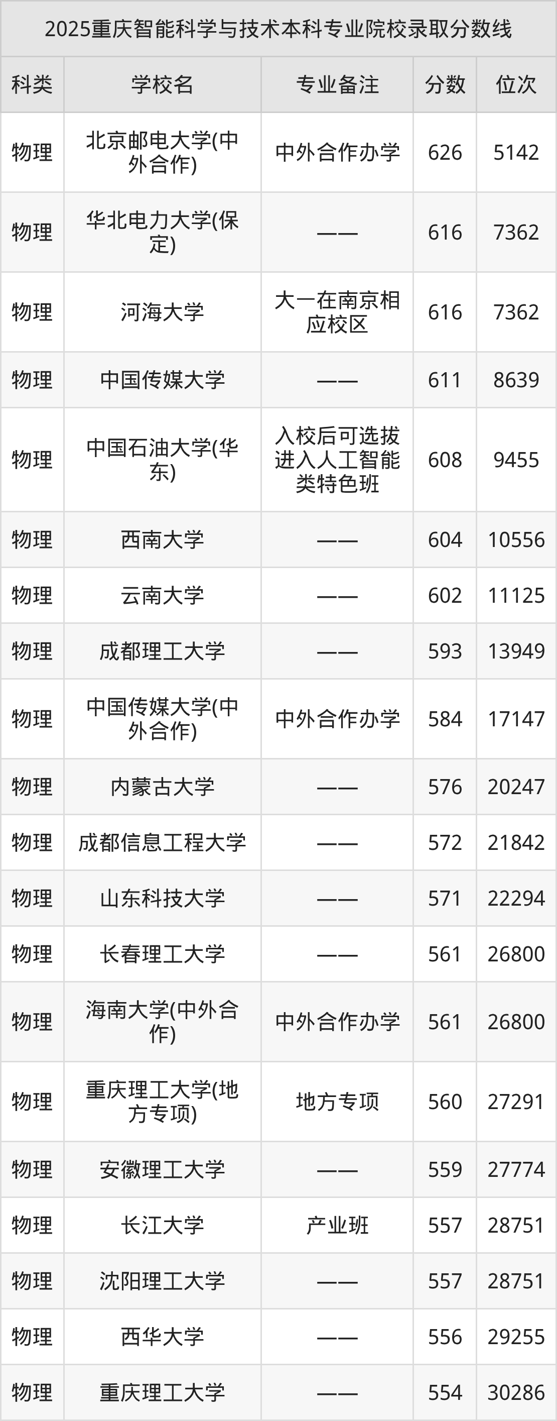 1、北京邮电大学(中外合作):智能科学与技术(中外合作办学)626分、物理类位次5142名;