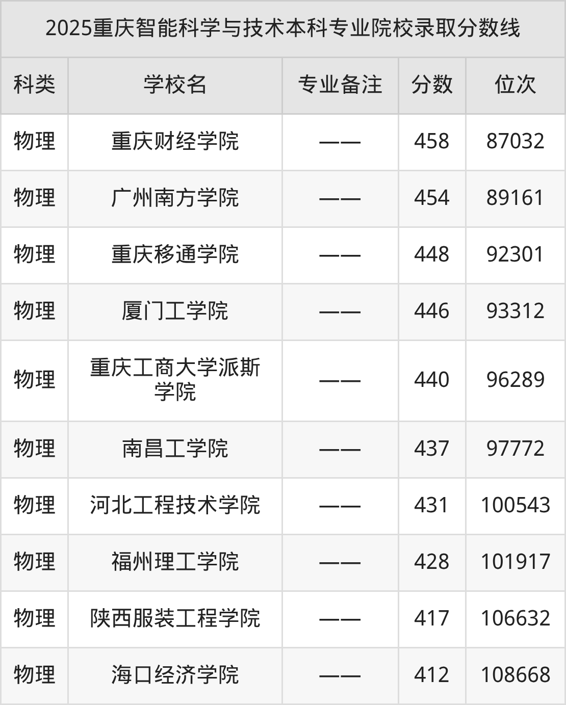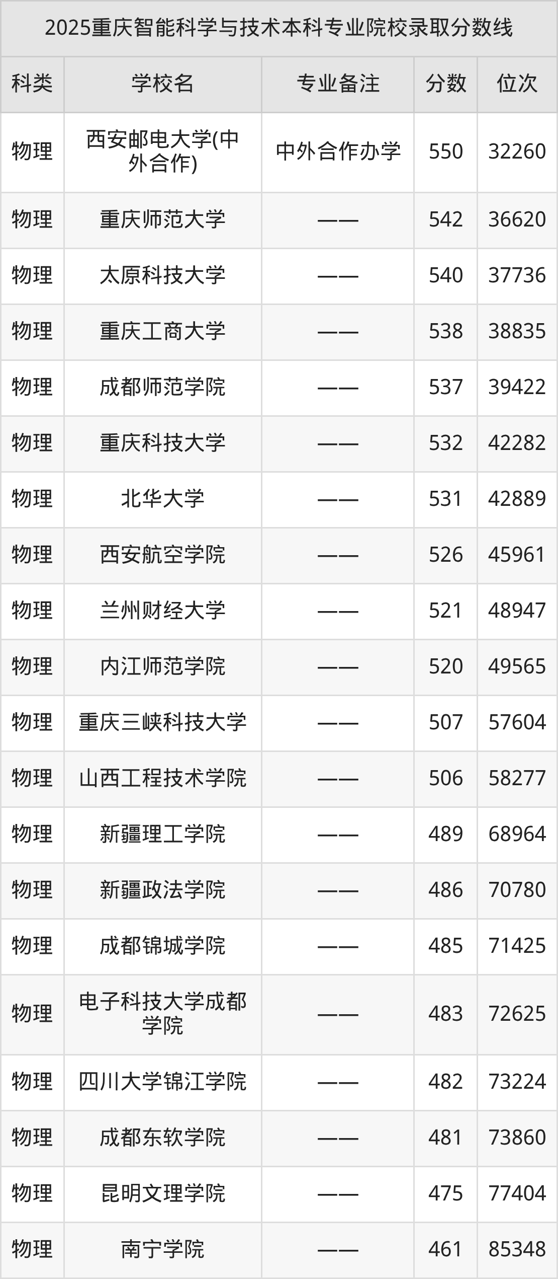 2025年重庆智能科学与技术分数线排名前5的大学名单(本科最难报考):