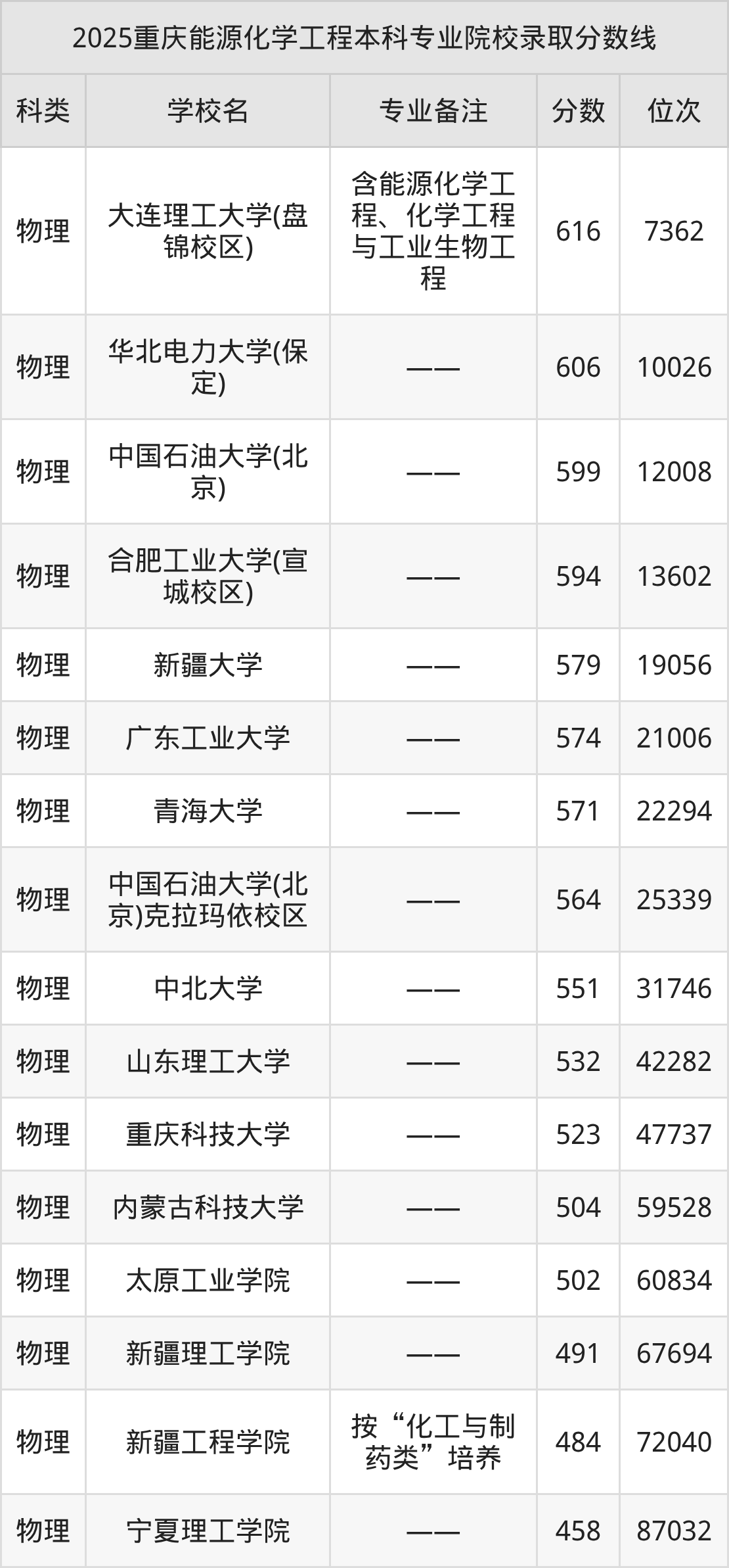 2025年重庆能源化学工程本科专业招生院校有15所,分数最低的是宁夏理工学院(458分、物理类位次87032名),分数最高的是大连理工大学(盘锦校区)(616分、物理类位次7362名)。