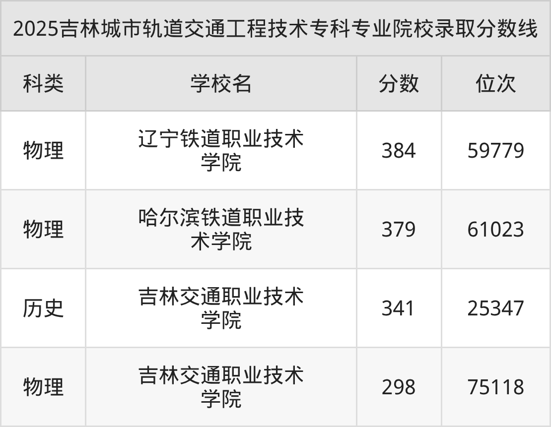 2025年吉林城市轨道交通工程技术分数线排名前4的大学名单(专科最难报考):