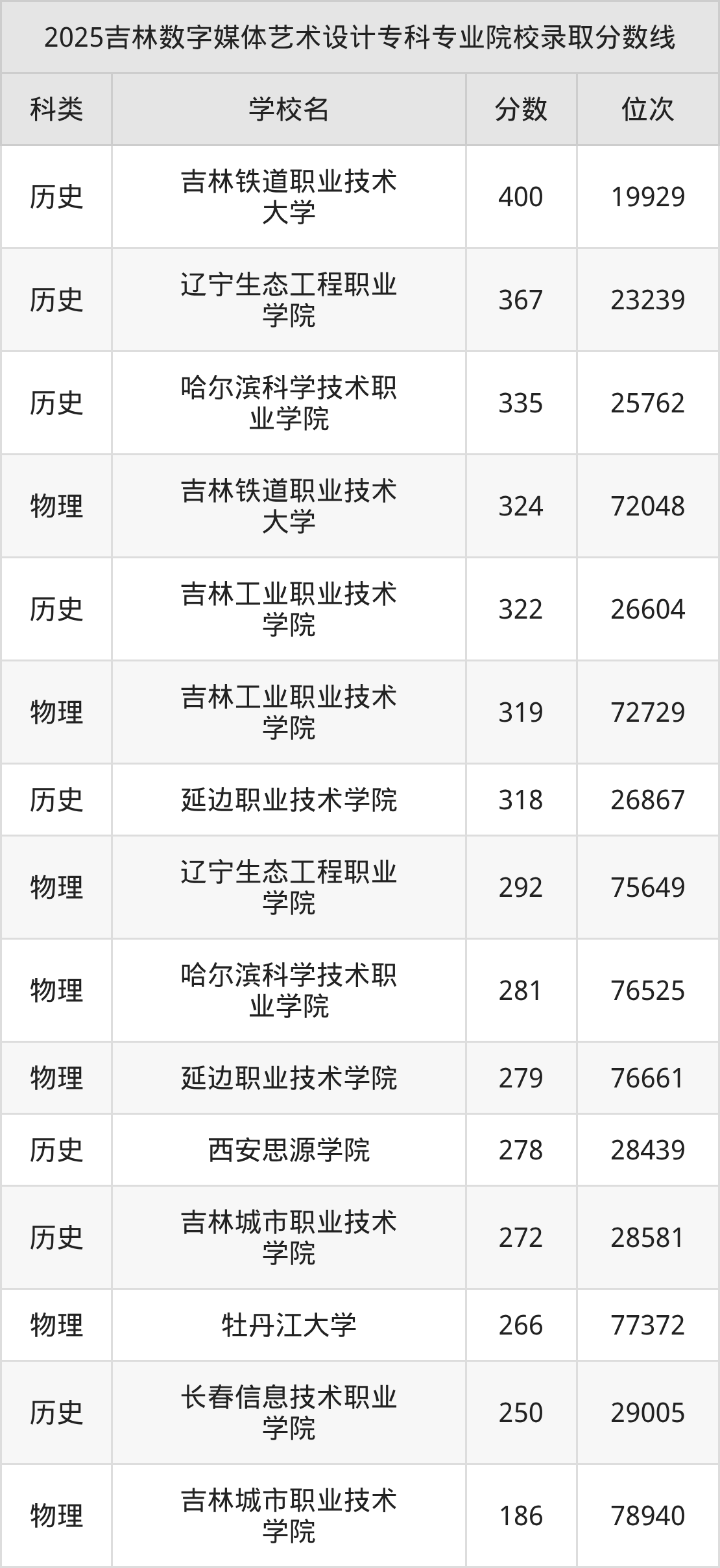 1、吉林铁道职业技术大学:数字媒体艺术设计400分、历史类位次19929名;
