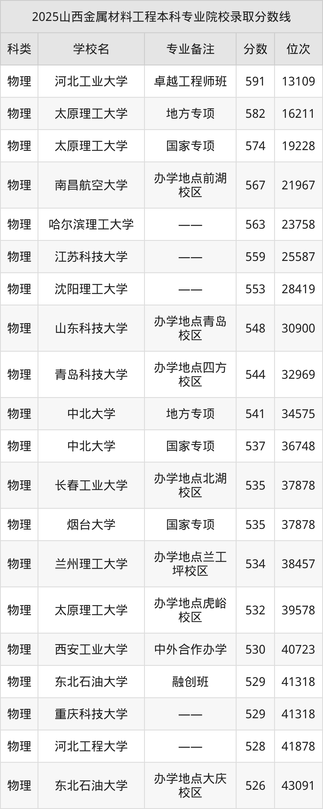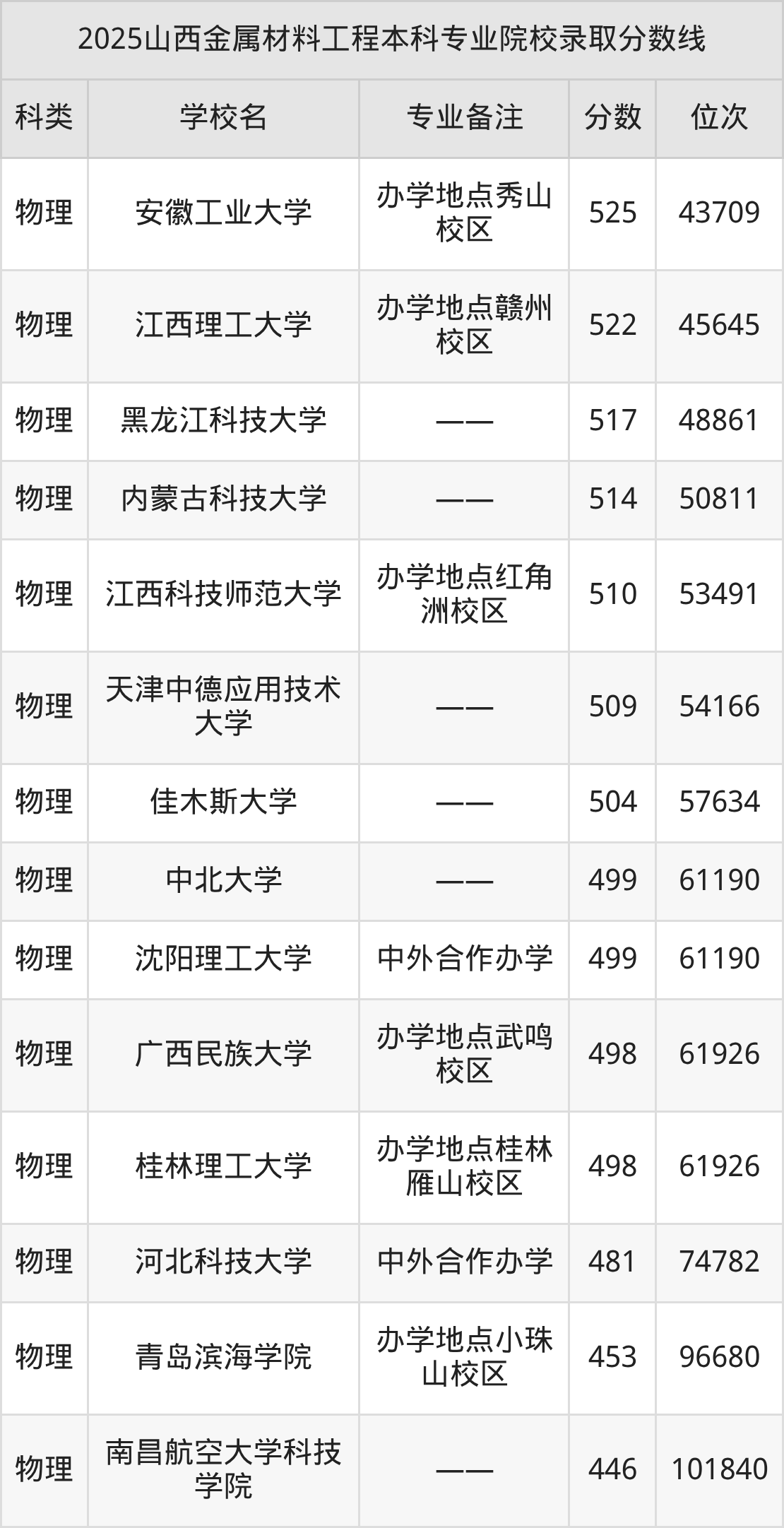 2025金属材料工程专业在山西省录取分数线为:本科446分-591分。结合批次线来看,考生成绩超本科线27分及以上即有机会就读金属材料工程本科专业,低分录取的本科院校有南昌航空大学科技学院。2026届考生可在下文查阅更多院校名单、分数及排名信息。