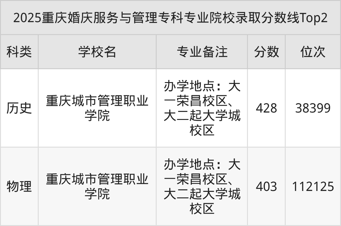 2025年重庆婚庆服务与管理专科专业招生院校只有1所,即重庆城市管理职业学院,2025年该校婚庆服务与管理专业在重庆市的最低录取分数线为403分,最低录取位次在112125名及以内(物理类)。