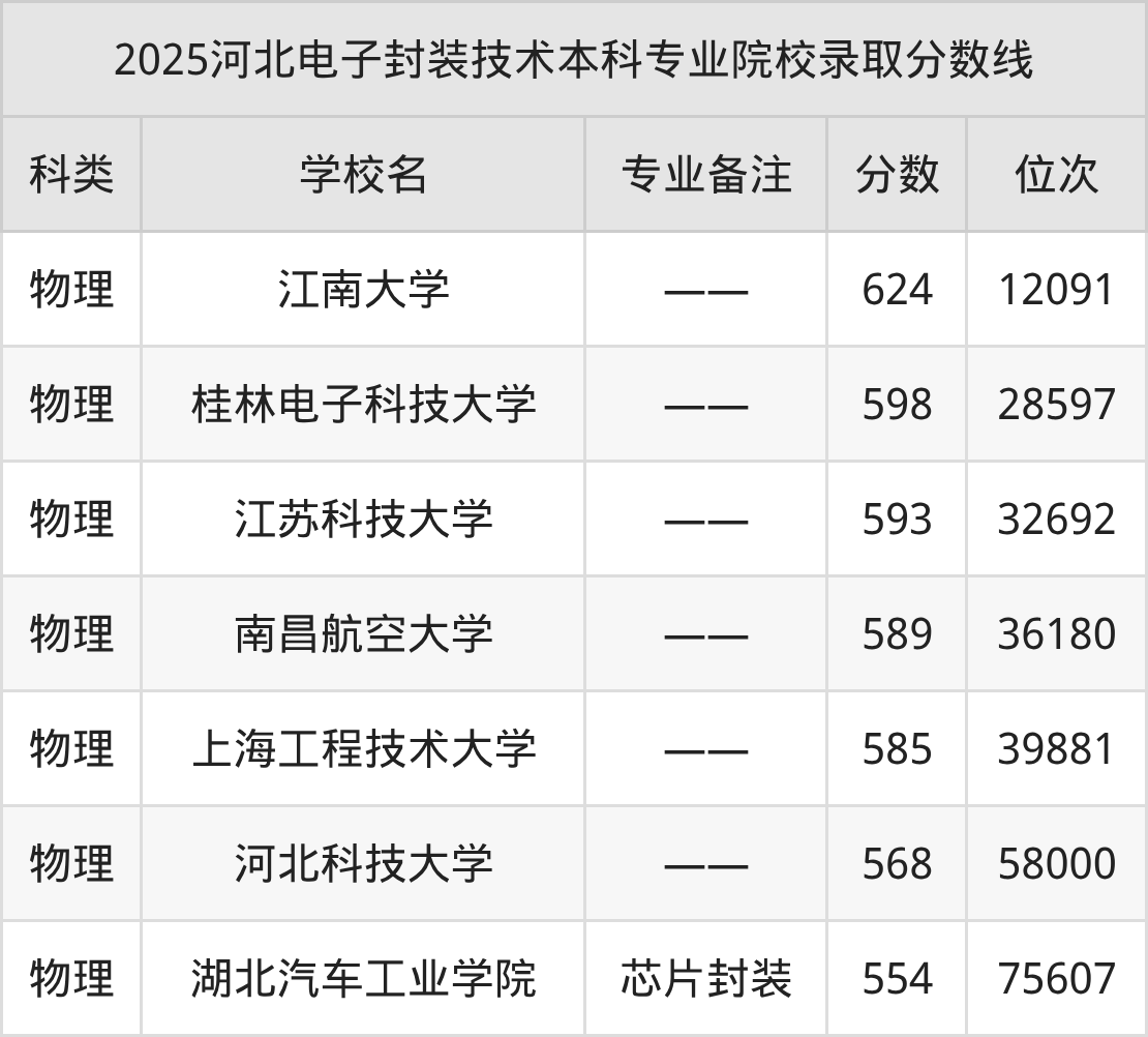 2025电子封装技术专业在河北省录取分数线为:本科554分-624分。结合批次线来看,考生成绩超本科线95分及以上即有机会就读电子封装技术本科专业,低分录取的本科院校有湖北汽车工业学院。2026届考生可在下文查阅更多院校名单、分数及排名信息。