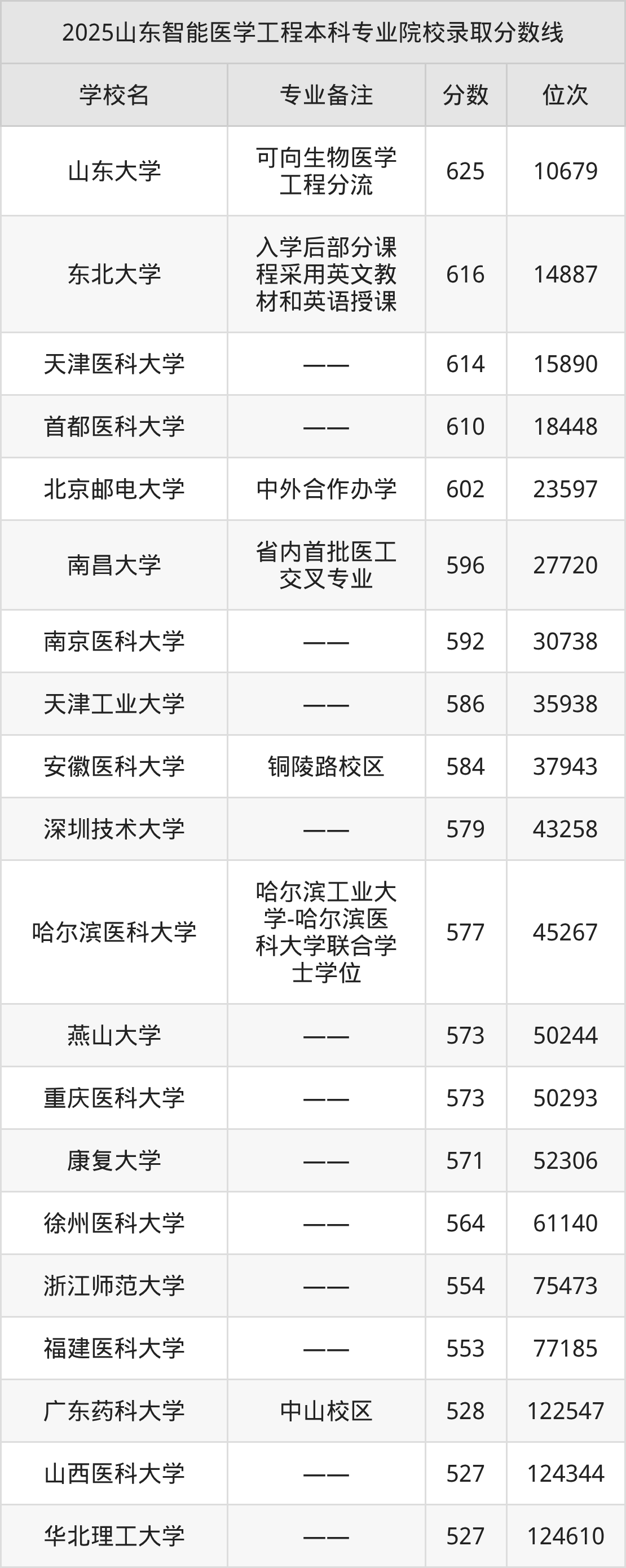 1、山东大学:智能医学工程(可向生物医学工程分流)625分、位次10679名;