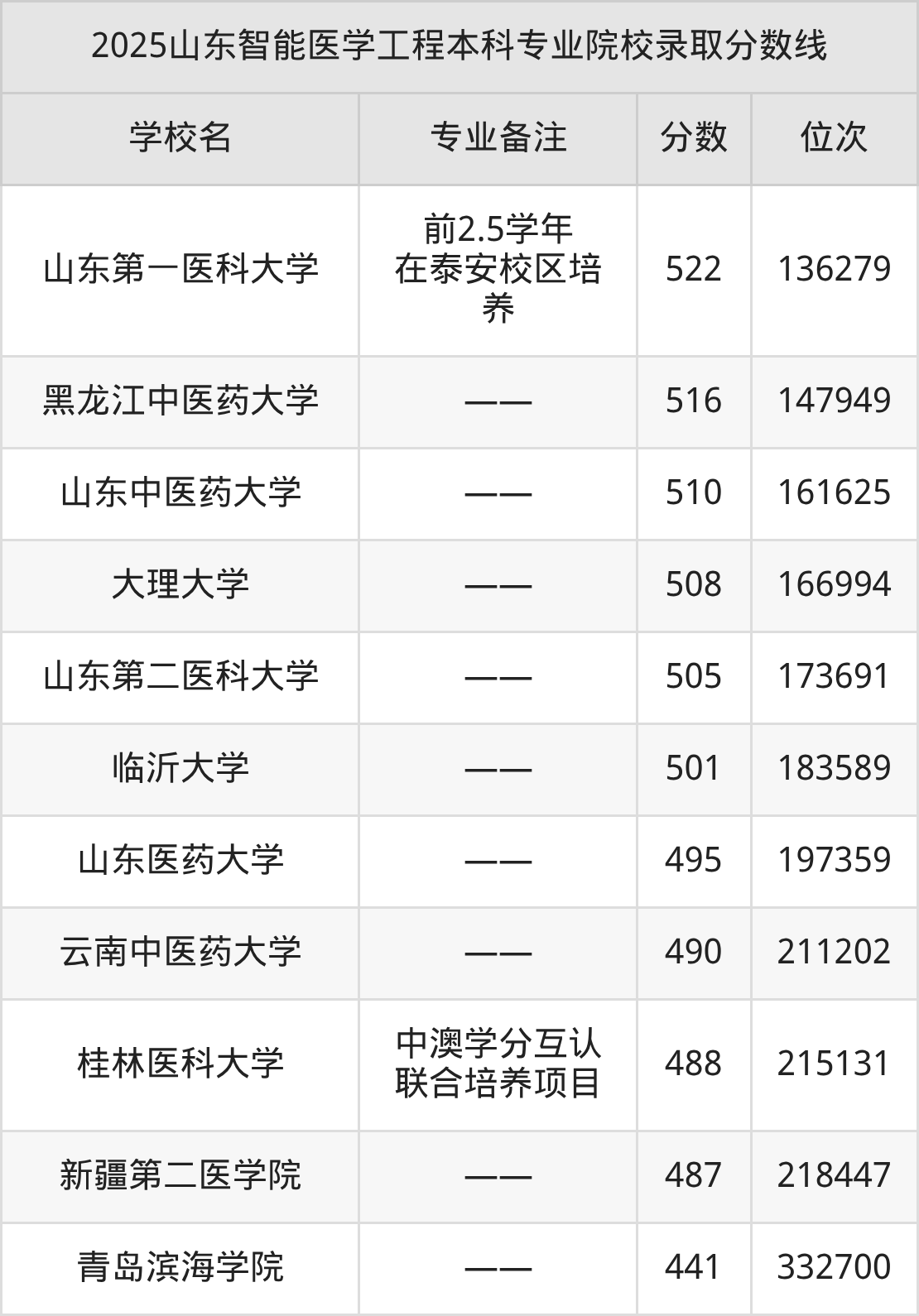 2025年山东智能医学工程分数线排名前5的大学名单(本科最难报考):