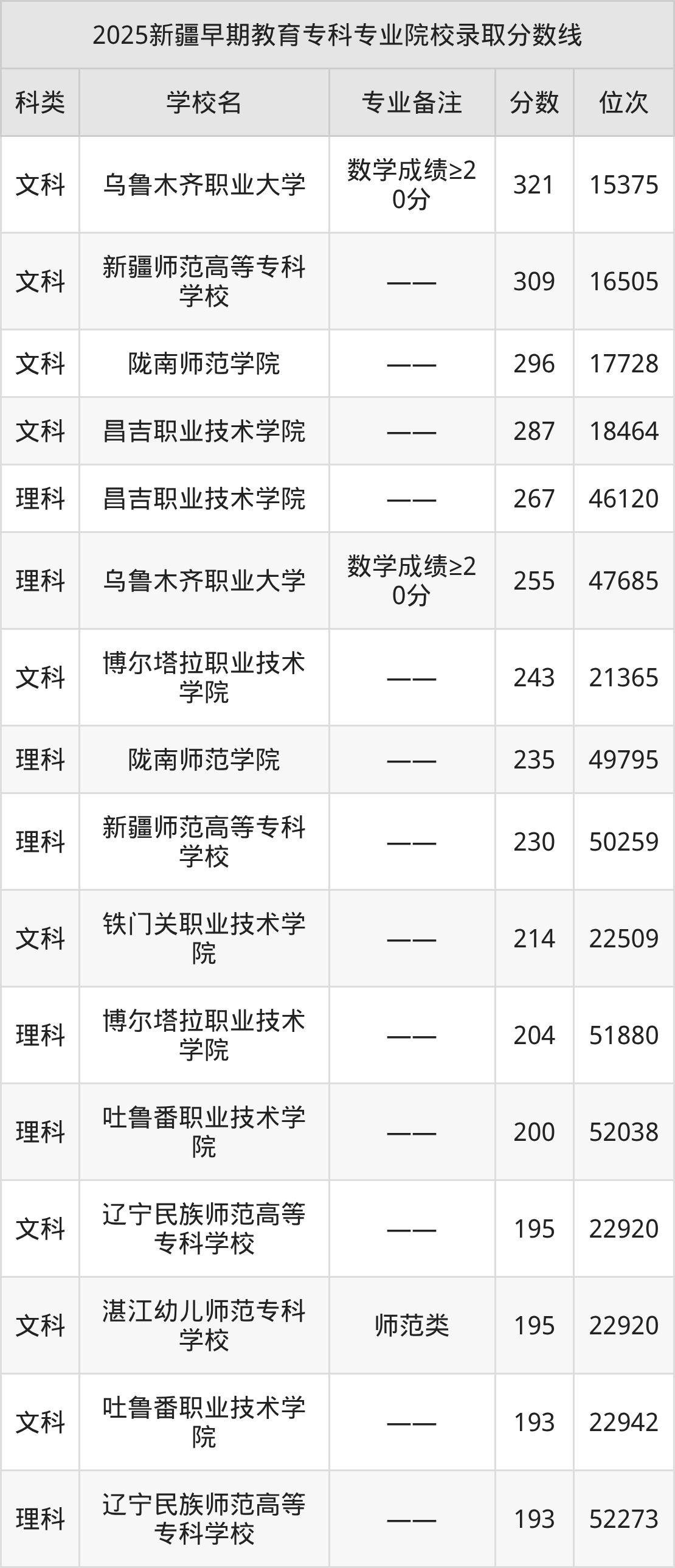 2025早期教育专业在新疆录取分数线为:专科193分-321分。结合批次线来看,考生成绩超专科线53分及以上即有机会就读早期教育专科专业,低分录取的专科院校有吐鲁番职业技术学院、辽宁民族师范高等专科学校。2026届考生可在下文查阅更多院校名单、分数及排名信息。