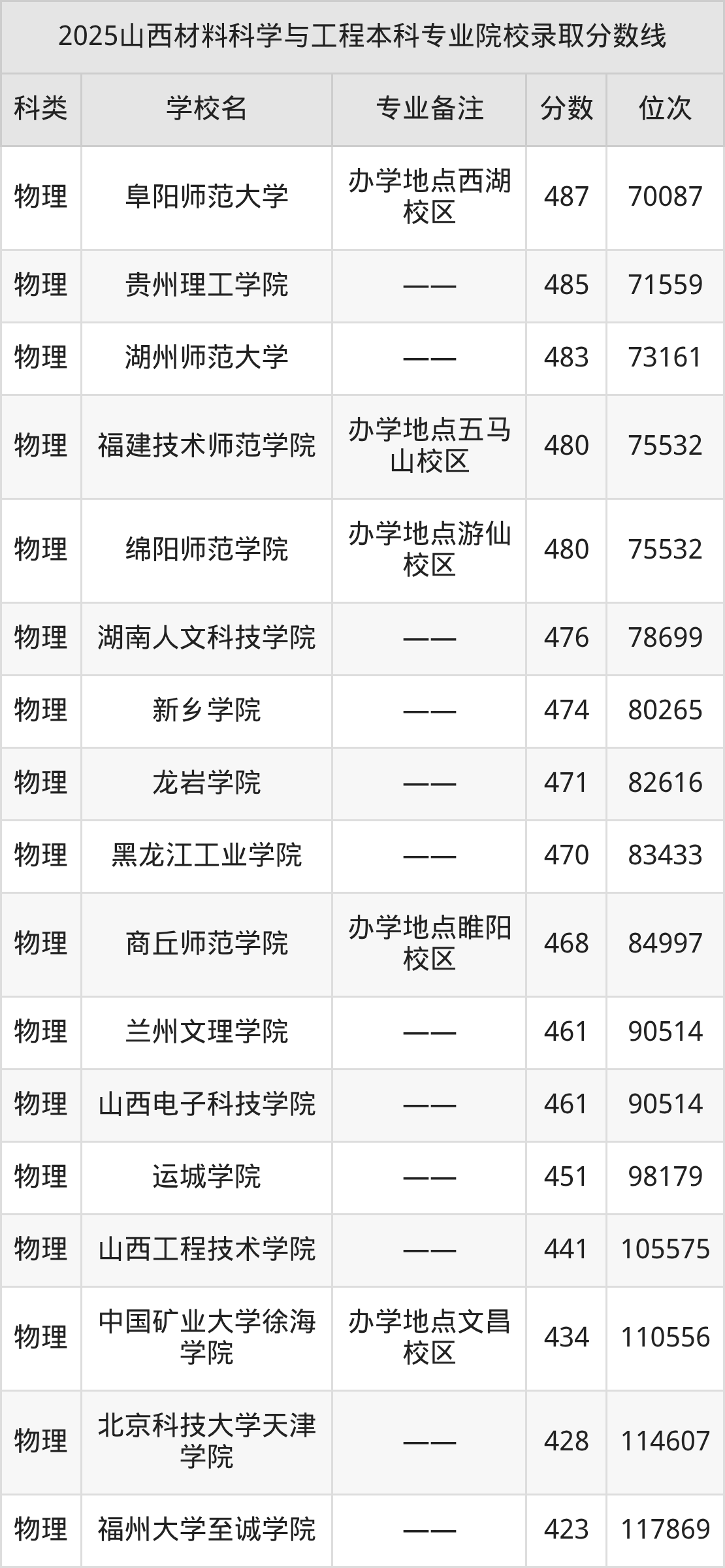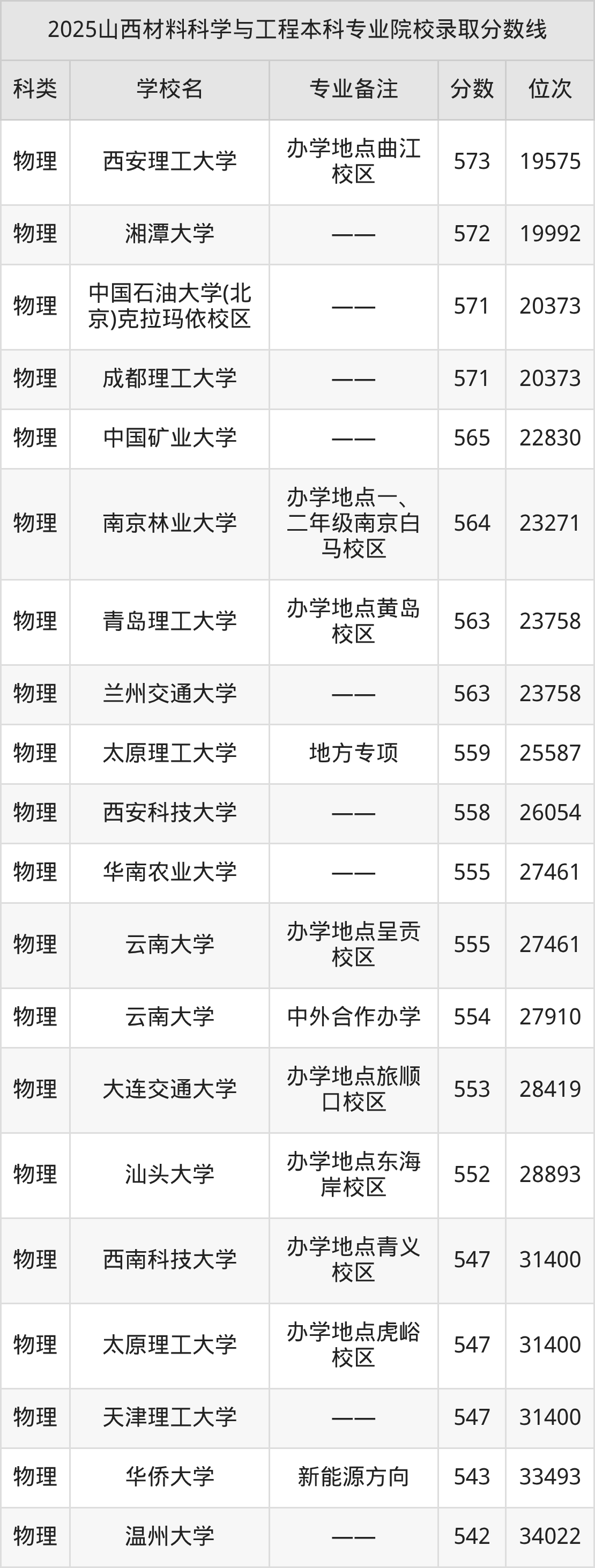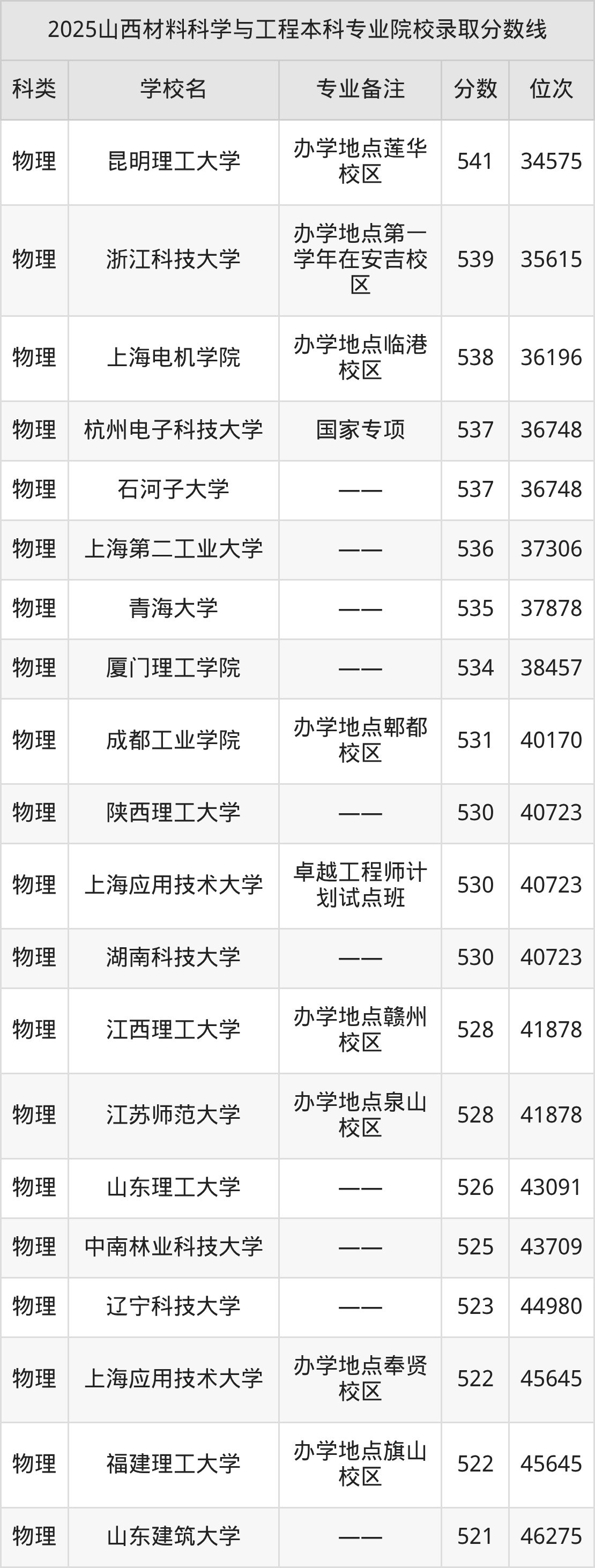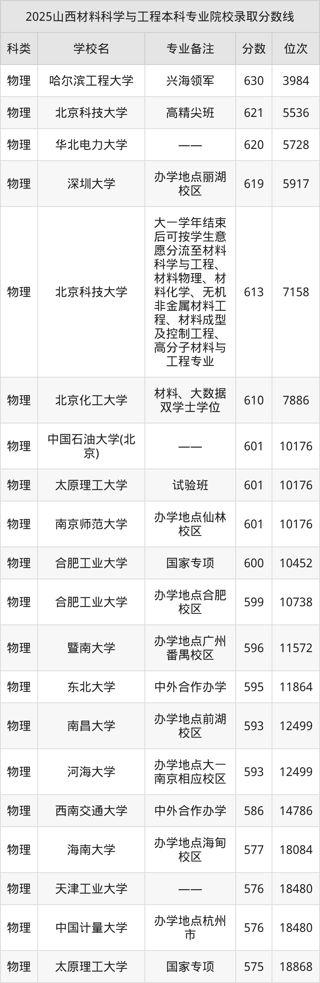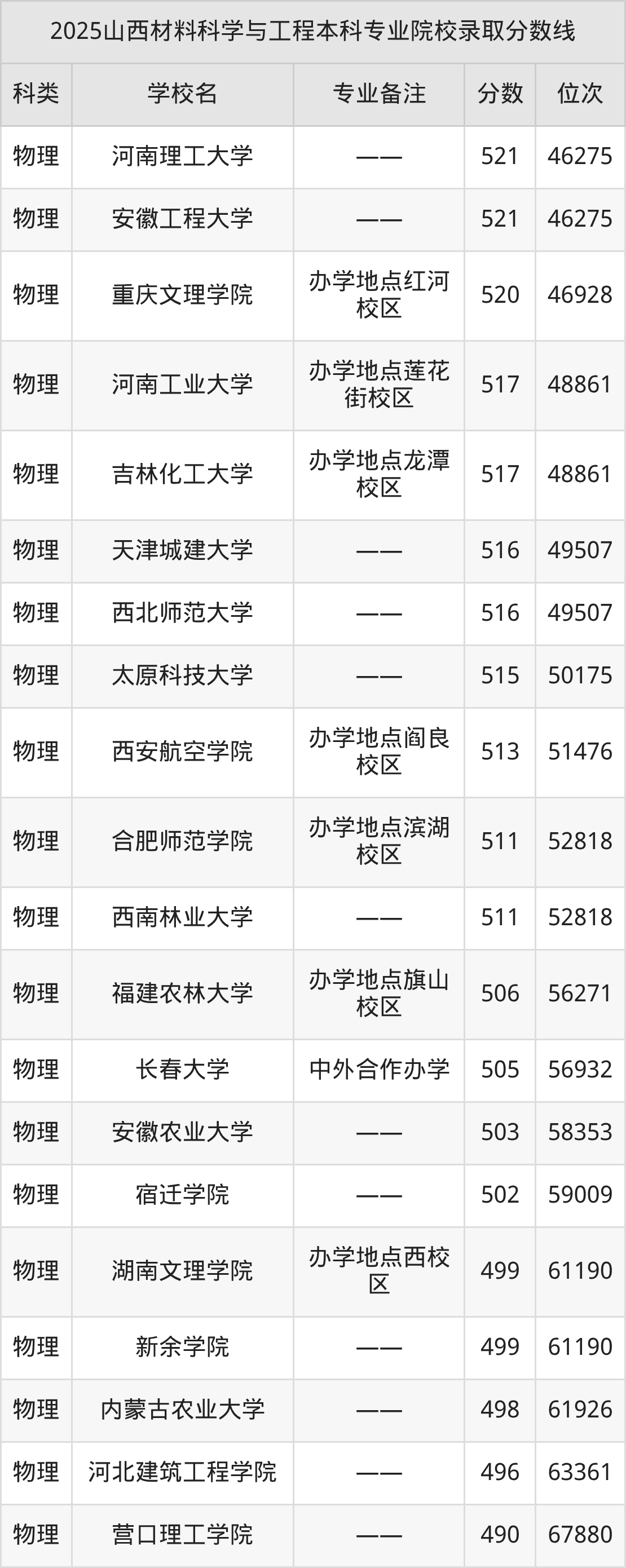 2025年山西材料科学与工程分数线排名前5的大学名单(本科最难报考):