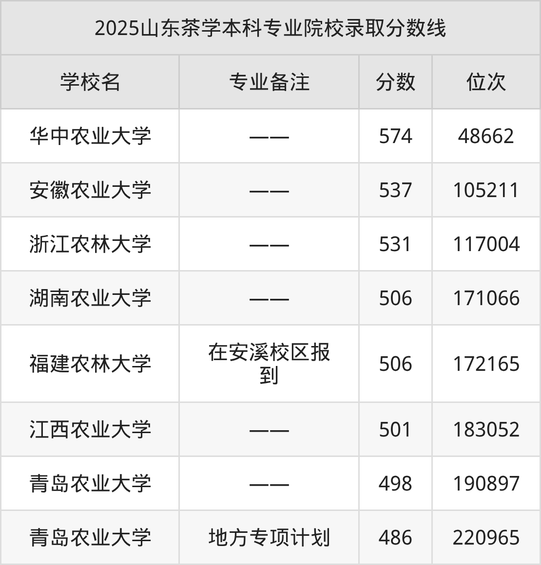 2025年山东茶学本科专业招生院校有7所,分数最低的是青岛农业大学(486分、位次220965名),分数最高的是华中农业大学(574分、位次48662名)。
