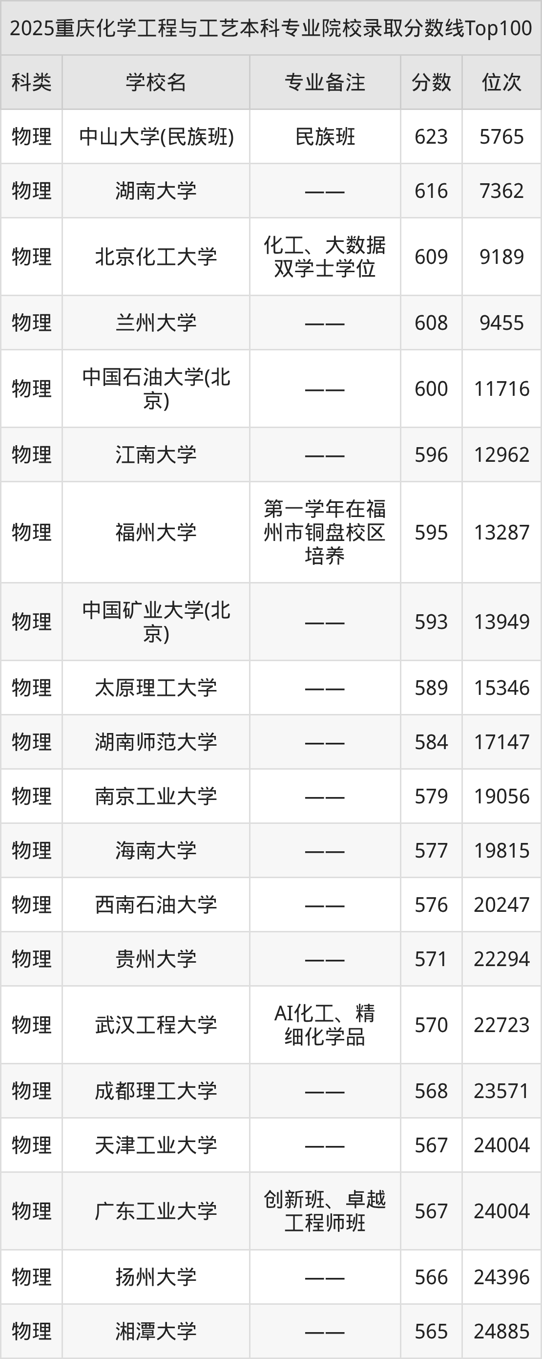 1、中山大学(民族班):化学工程与工艺(民族班)623分、物理类位次5765名;