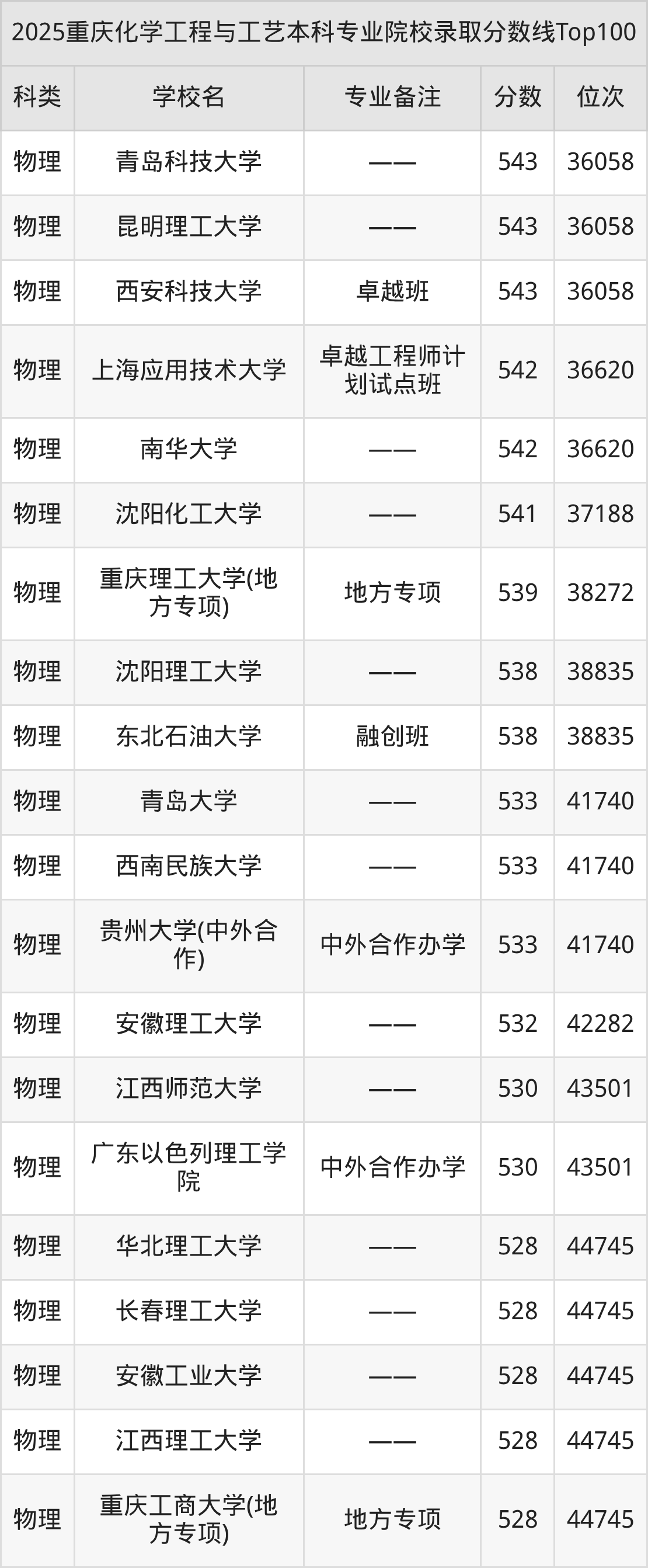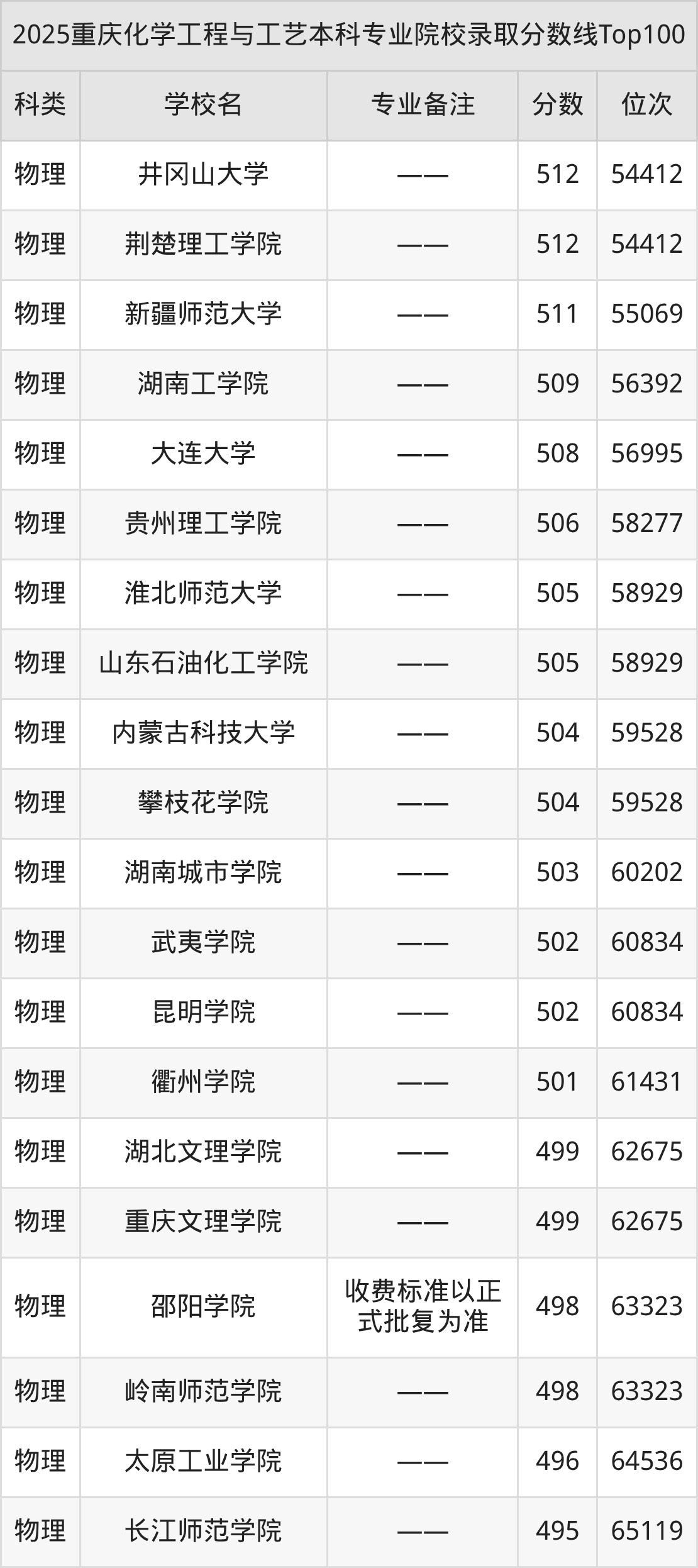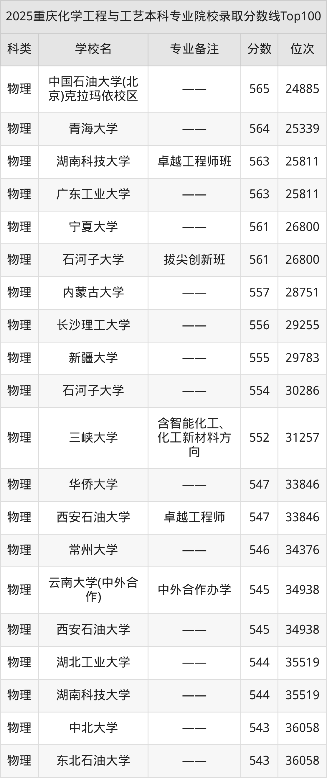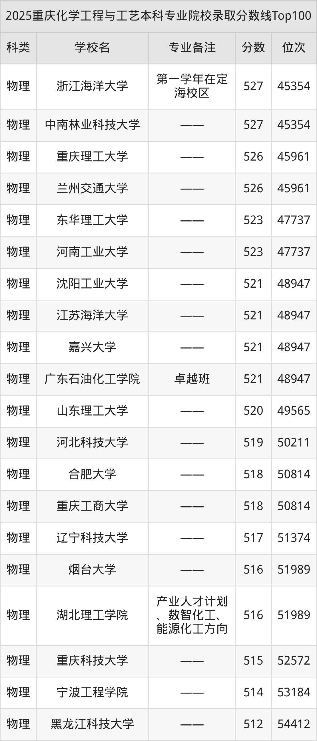 2025年重庆化学工程与工艺分数线排名前5的大学名单(本科最难报考):