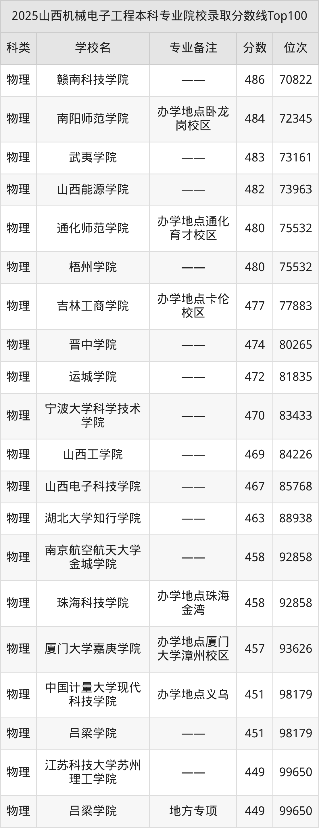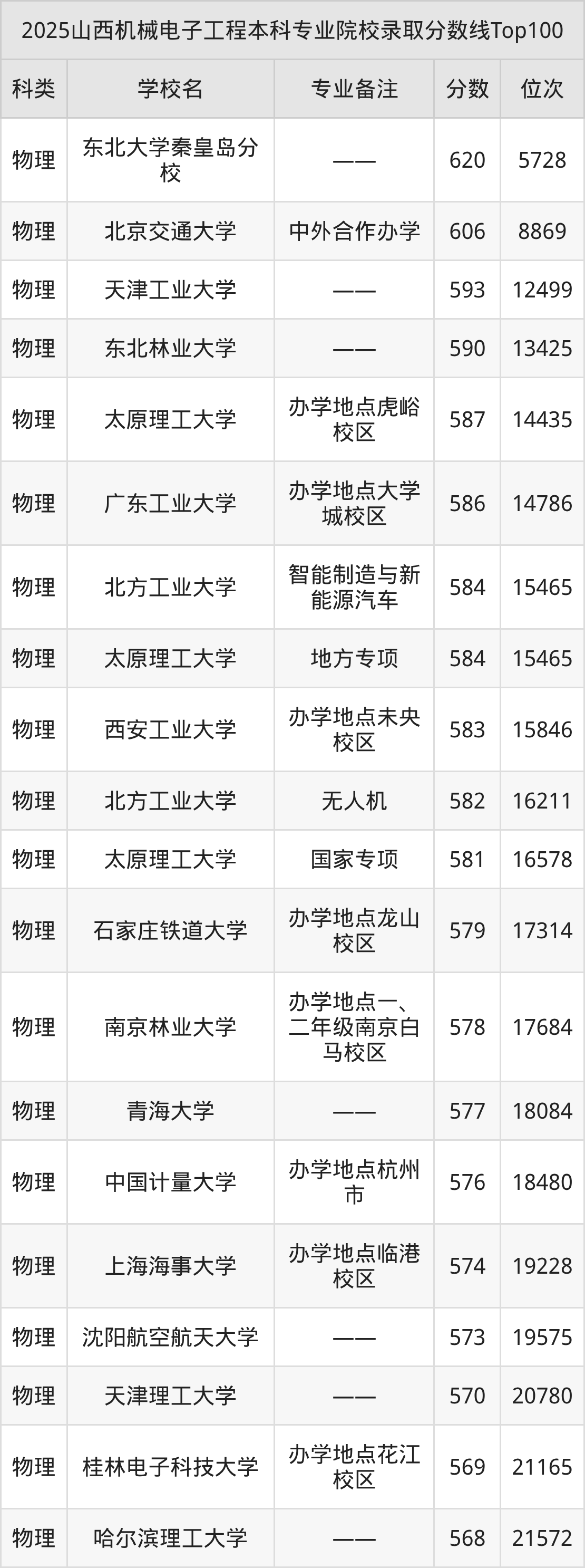 2025年山西机械电子工程本科专业招生院校有108所,分数最低的是无锡太湖学院(422分、物理类位次118513名),分数最高的是东北大学秦皇岛分校(620分、物理类位次5728名)。