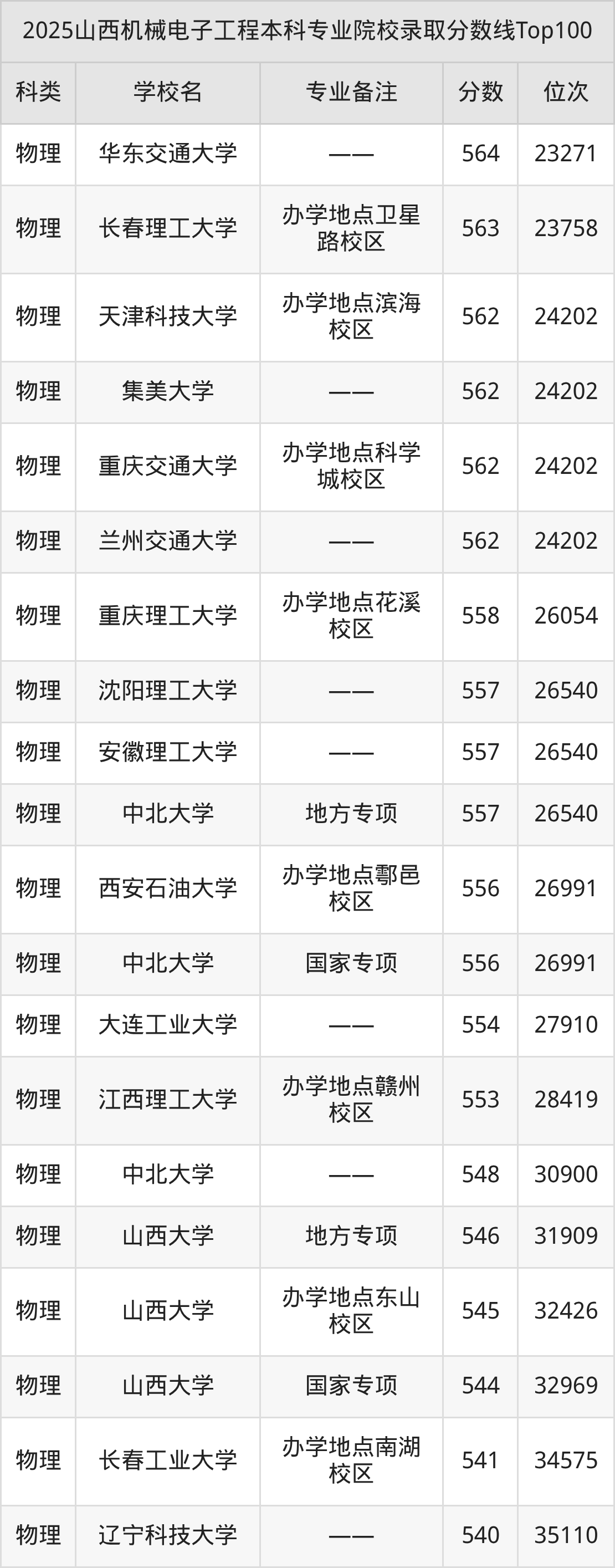 2025机械电子工程专业在山西省录取分数线为:本科422分-620分。结合批次线来看,考生成绩超本科线3分及以上即有机会就读机械电子工程本科专业,低分录取的本科院校有无锡太湖学院。2026届考生可在下文查阅更多院校名单、分数及排名信息。