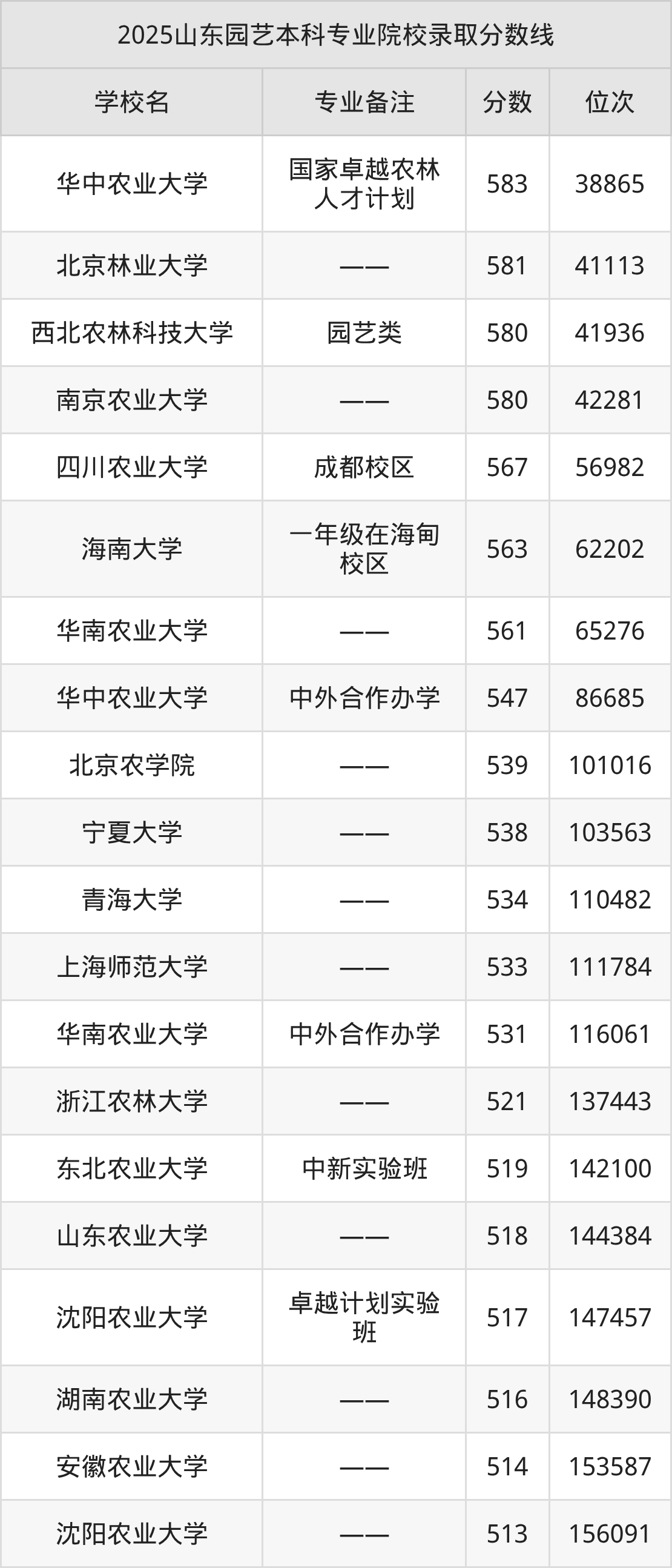 1、华中农业大学:园艺(国家卓越农林人才计划)583分、位次38865名;