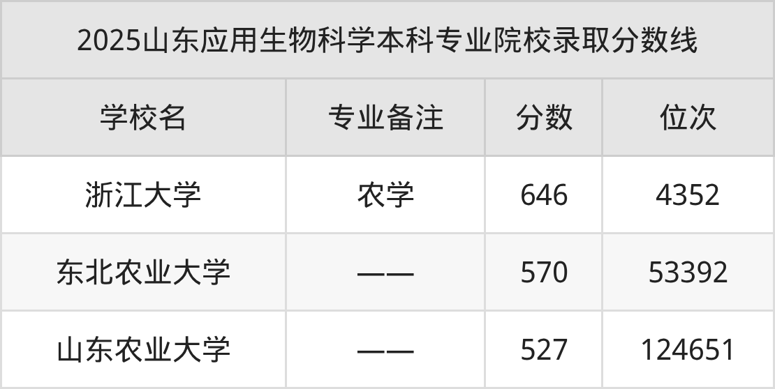 2025年山东应用生物科学本科专业招生院校有3所,分数最低的是山东农业大学(527分、位次124651名),分数最高的是浙江大学(646分、位次4352名)。