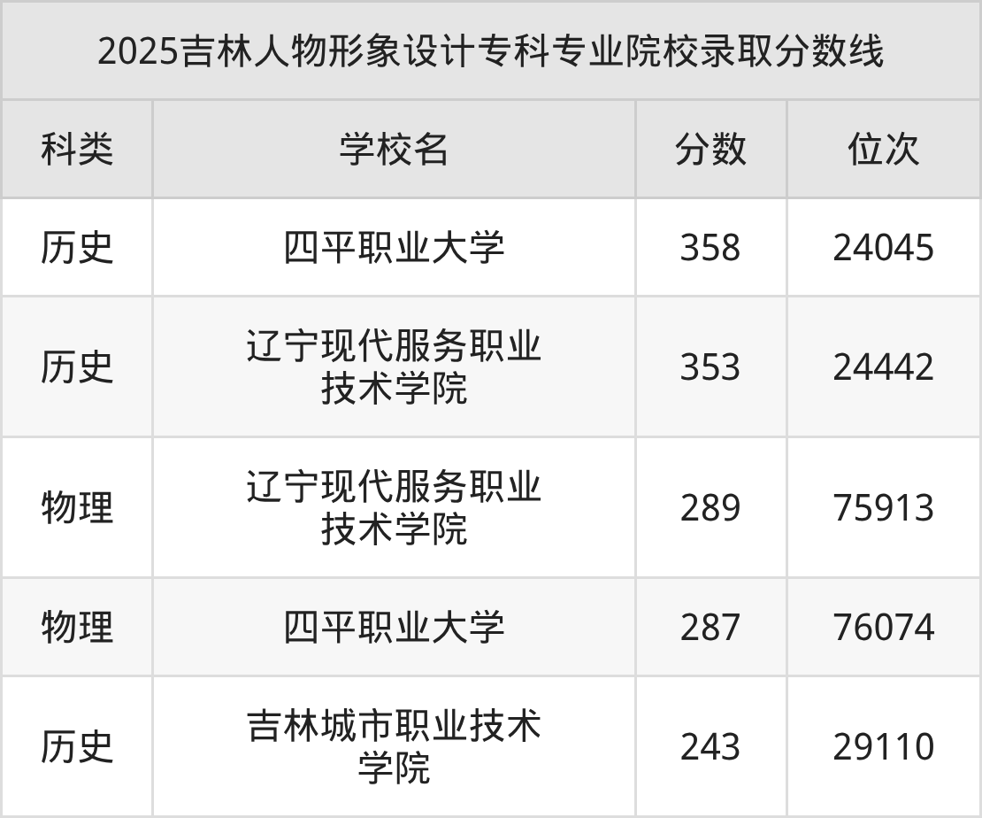 1、四平职业大学:人物形象设计358分、历史类位次24045名;