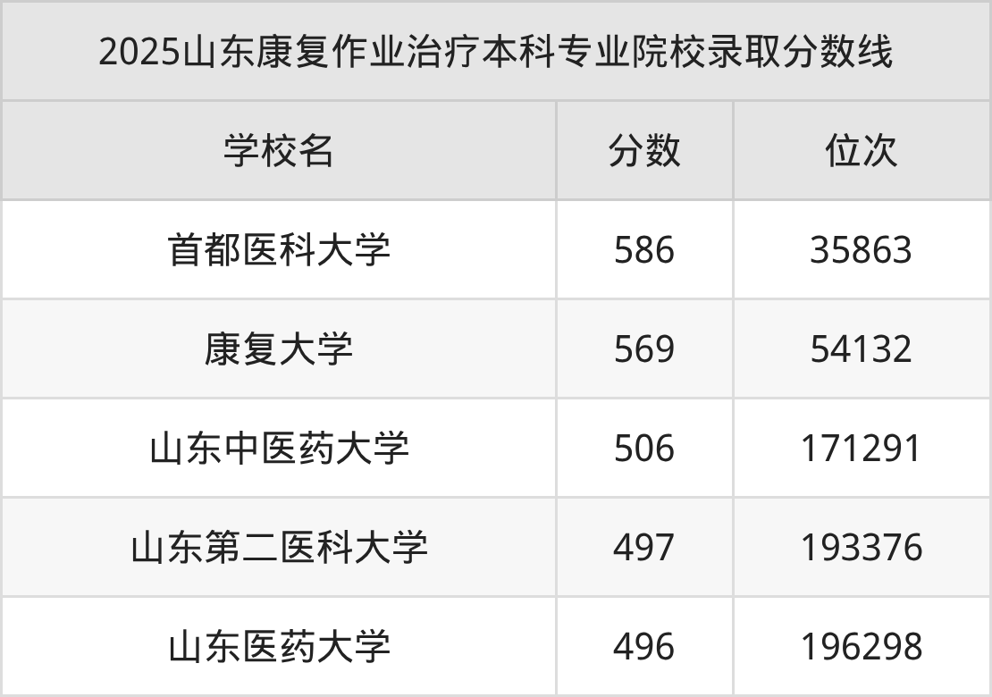 2025年山东康复作业治疗分数线排名前5的大学名单(本科最难报考):