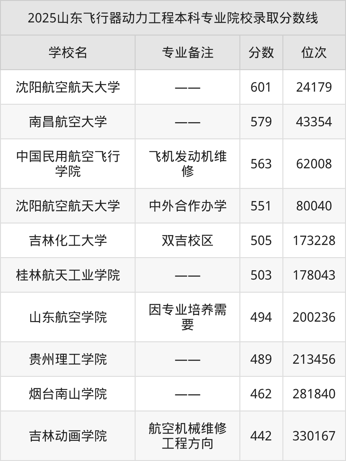 2025年山东飞行器动力工程本科专业招生院校有9所,分数最低的是吉林动画学院(442分、位次330167名),分数最高的是沈阳航空航天大学(601分、位次24179名)。