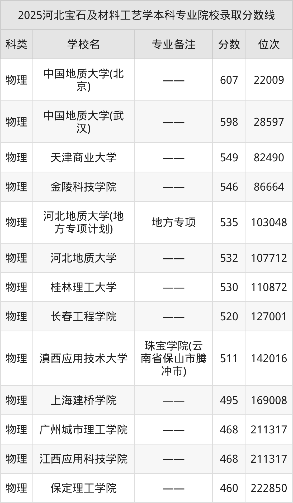 2025年河北宝石及材料工艺学本科专业招生院校有12所,分数最低的是保定理工学院(460分、物理类位次222850名),分数最高的是中国地质大学(北京)(607分、物理类位次22009名)。