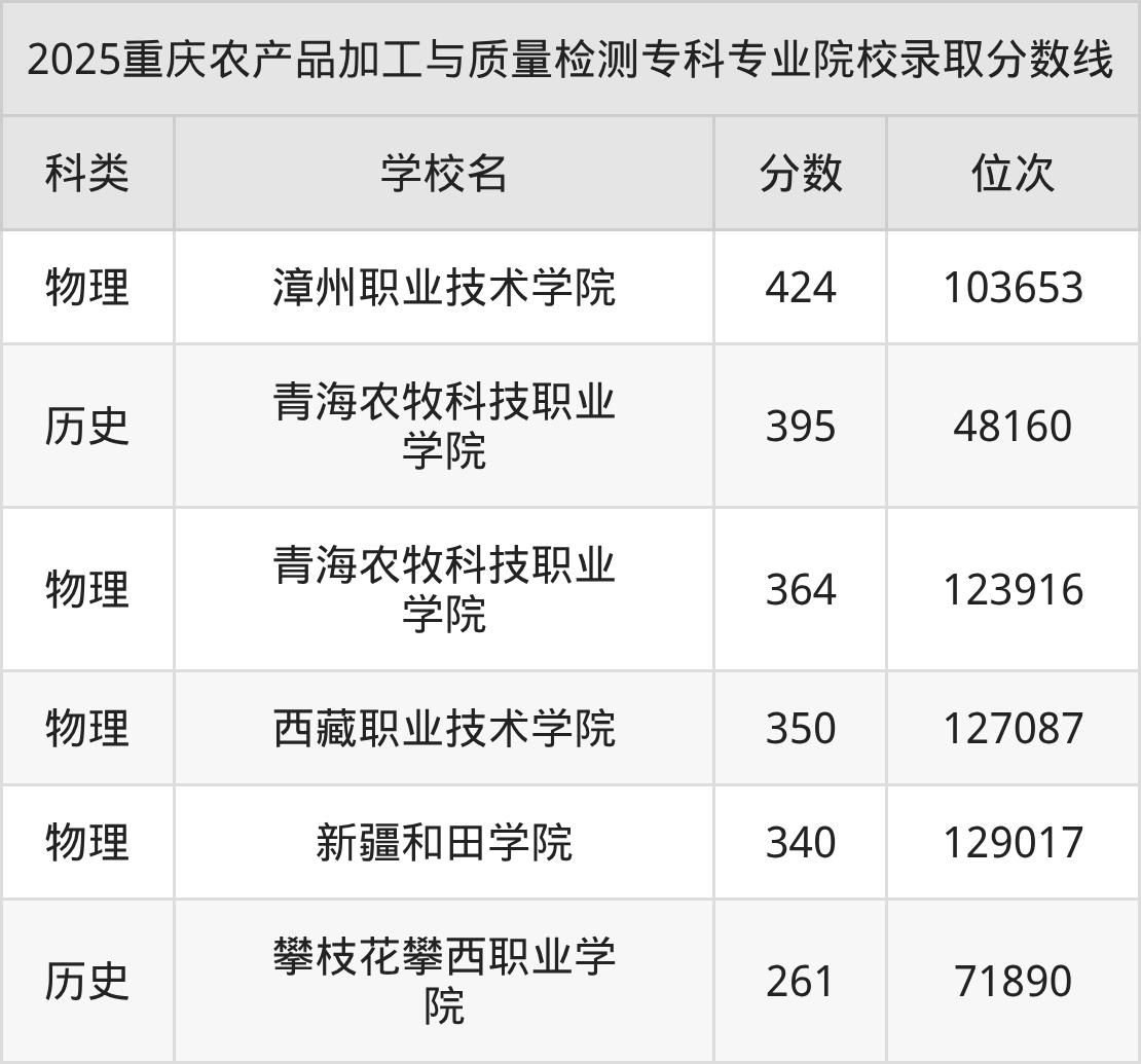 2025年重庆农产品加工与质量检测专科专业招生院校有5所,分数最低的是攀枝花攀西职业学院(261分、历史类位次71890名),分数最高的是漳州职业技术学院(424分、物理类位次103653名)。