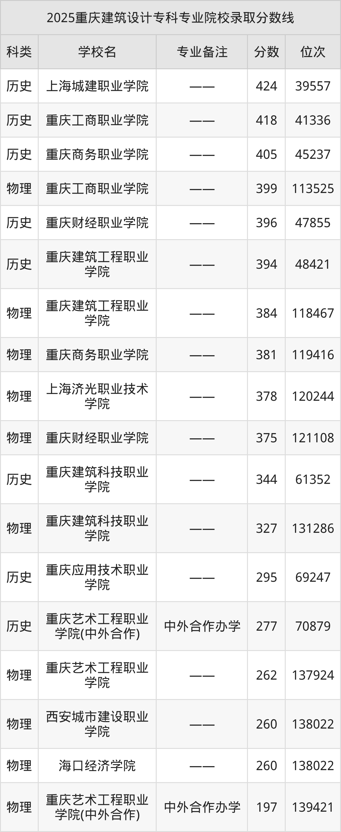 2025年重庆建筑设计专科专业招生院校有11所,分数最低的是重庆艺术工程职业学院(中外合作)(197分、物理类位次139421名),分数最高的是上海城建职业学院(424分、历史类位次39557名)。