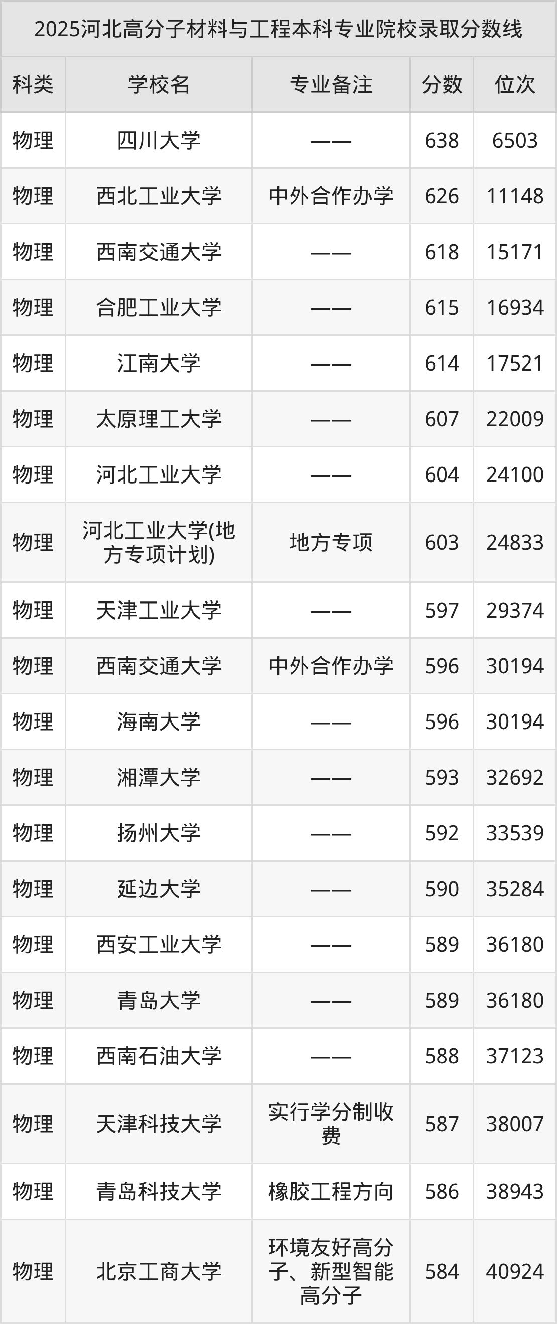 1、四川大学:高分子材料与工程638分、物理类位次6503名;