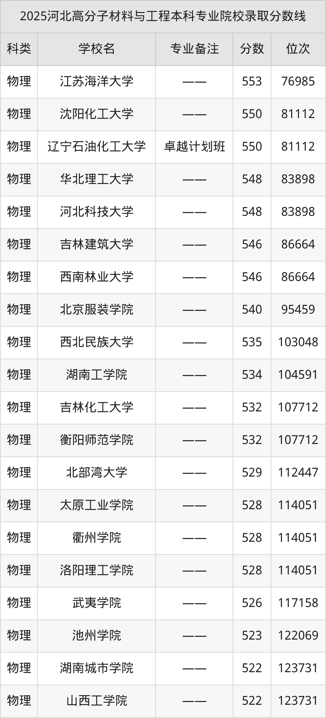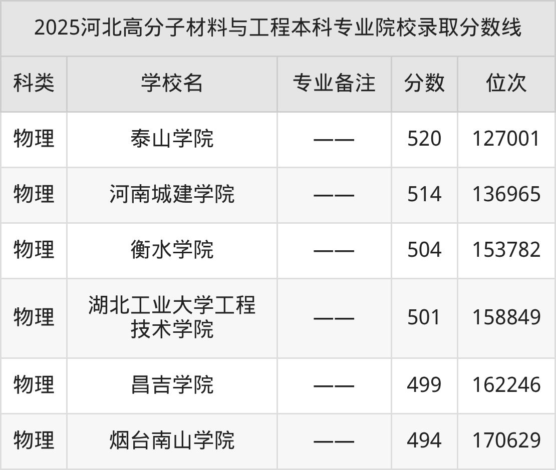 2025高分子材料与工程专业在河北省录取分数线为:本科494分-638分。结合批次线来看,考生成绩超本科线35分及以上即有机会就读高分子材料与工程本科专业,低分录取的本科院校有烟台南山学院。2026届考生可在下文查阅更多院校名单、分数及排名信息。