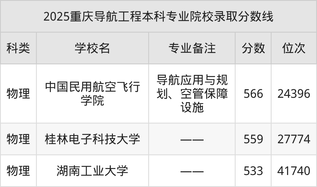 2025年重庆导航工程本科专业招生院校有3所,分数最低的是湖南工业大学(533分、物理类位次41740名),分数最高的是中国民用航空飞行学院(566分、物理类位次24396名)。