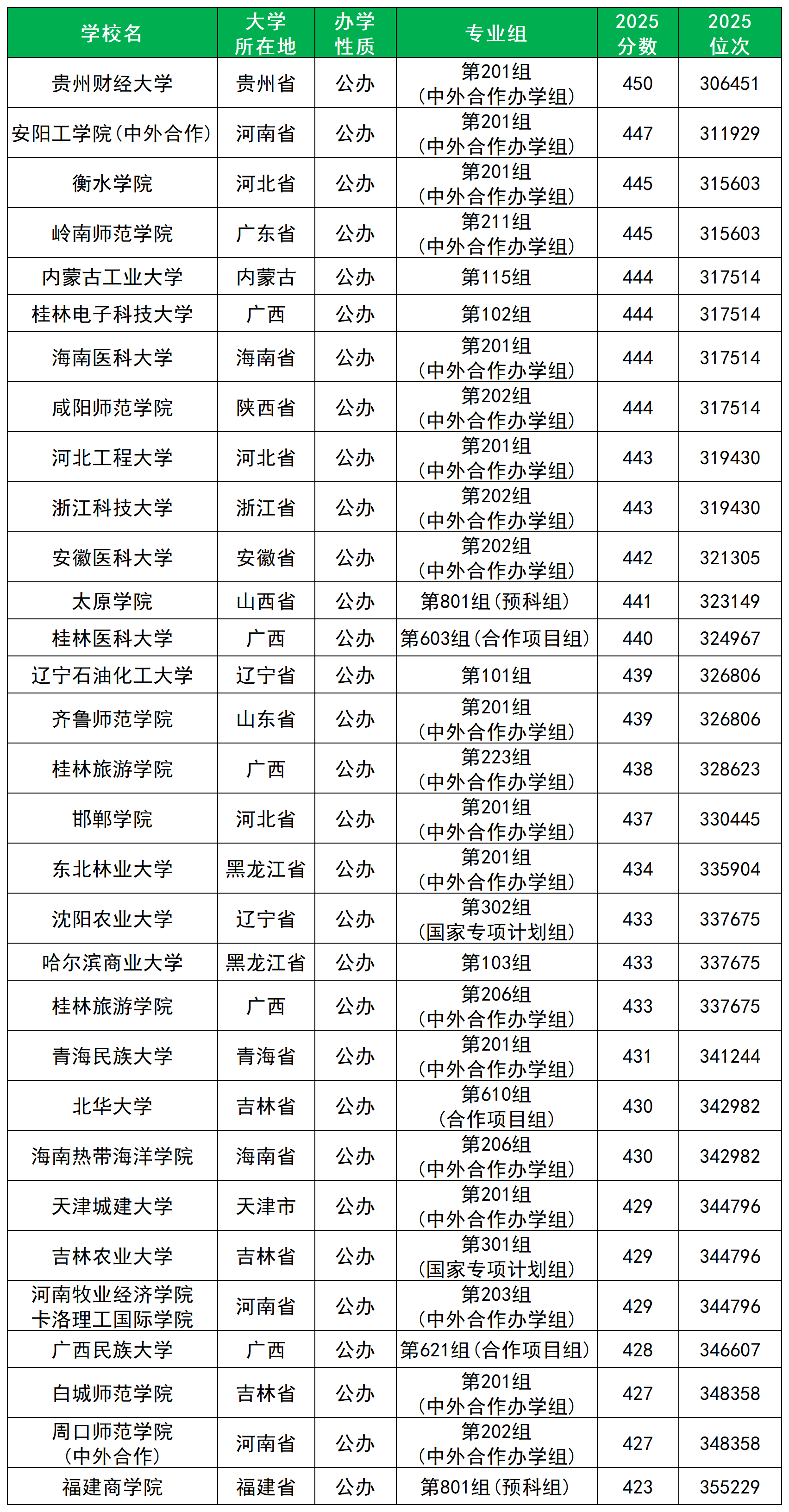 分数最高为450分,对应院校为贵州财经大学(中外合办第201组);其次为447分,对应院校为安阳工学院(中外合办第447组)。
